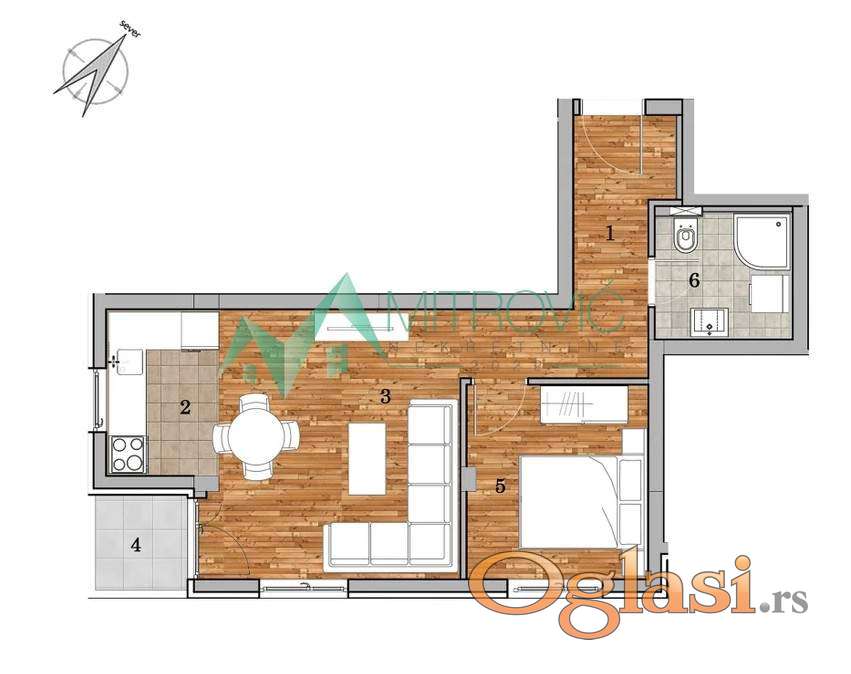 Komforan i funkcionalan dvosoban stan na prvom spratu, idealan za udoban svakodnevni život ili kao sigurna investicija. Stan se odlikuje odličnim rasporedom – prostran dnevni boravak sa kuhinjom i trpezarijskim delom čini centralni deo stana, dok je spavaća soba izdvojena i pruža potreban mir i privatnost.