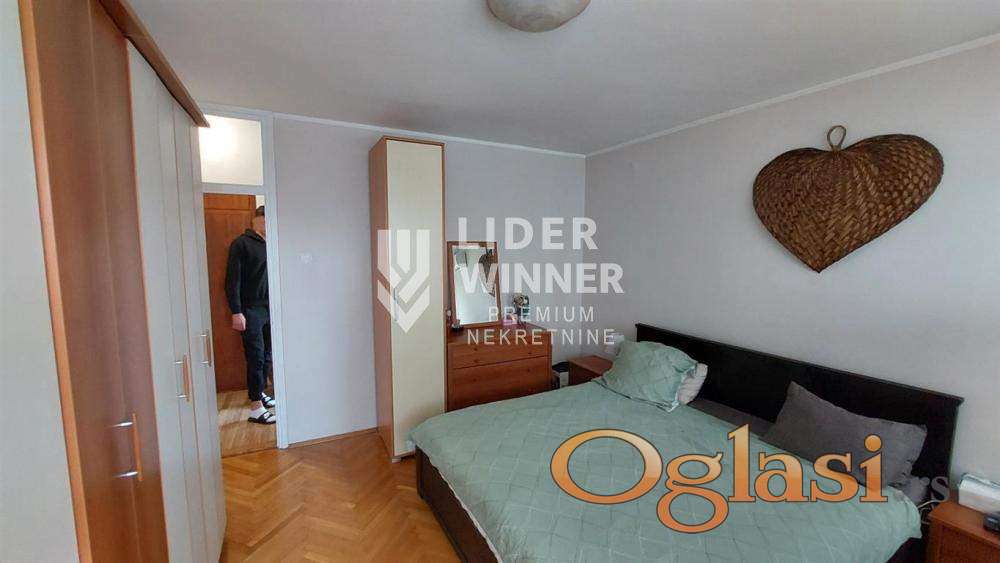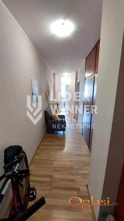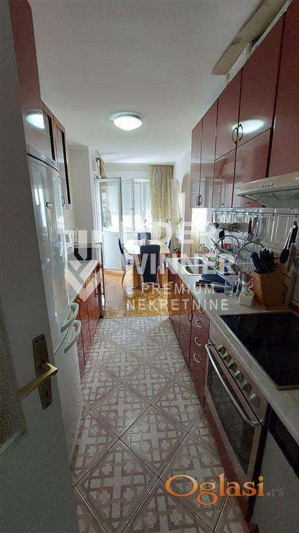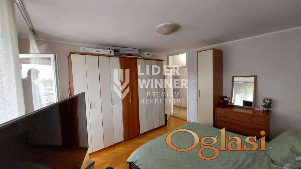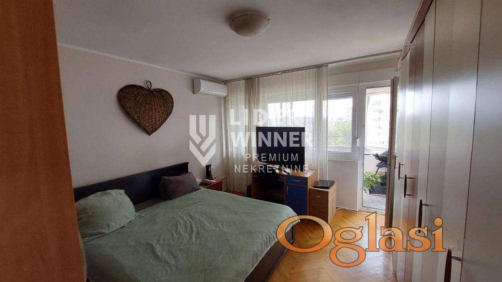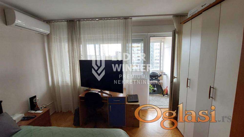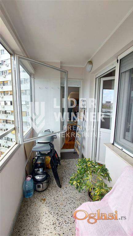 Zgrada uredna i održavana. Video nadzor i interfon. Parkići za decu, osnovna škola, vrtić, prodavnice, izlaz na auto - put, u blizini je most na Adi. Pogodan i kao investicija, za izdavanje i za miran, porodičan život. Internet, KaTV, 5 liftova, prilaz za invalide. Hodnik iz koga se ulazi u dnevnu sobu, kuhinja dvostrana, trpezarija, spavaća soba, kupatilo, lođa na koju je izlaz iz trpezarije i spavaće sobe. Podrum. Renoviran stan. Gleda na park, istočno orijentisan. Prostrane prostorije. Ugradni plakari u hodniku. Zastakljena lođa. PVC. Moguće je adaptirati u 2.5. agencijska provizija 2%