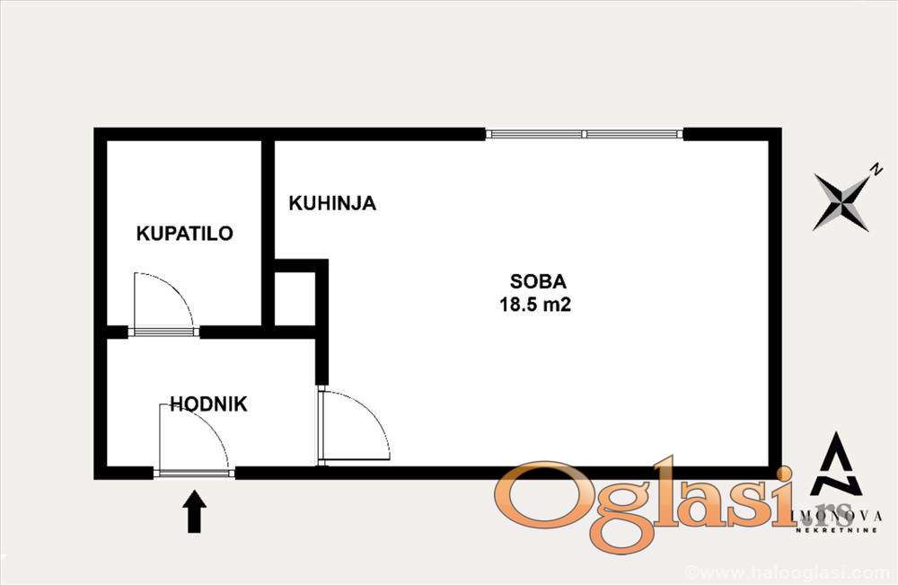Stan ima funkcionalan raspored: ulazni hodnik sa prostorom za garderober i cipelarnik, prostrano kupatilo, kao i glavnu sobu površine 18,5 m² sa kuhinjskom nišom. Prostor omogućava organizaciju dnevnog boravka, dela za spavanje i trpezarijskog kutka.
