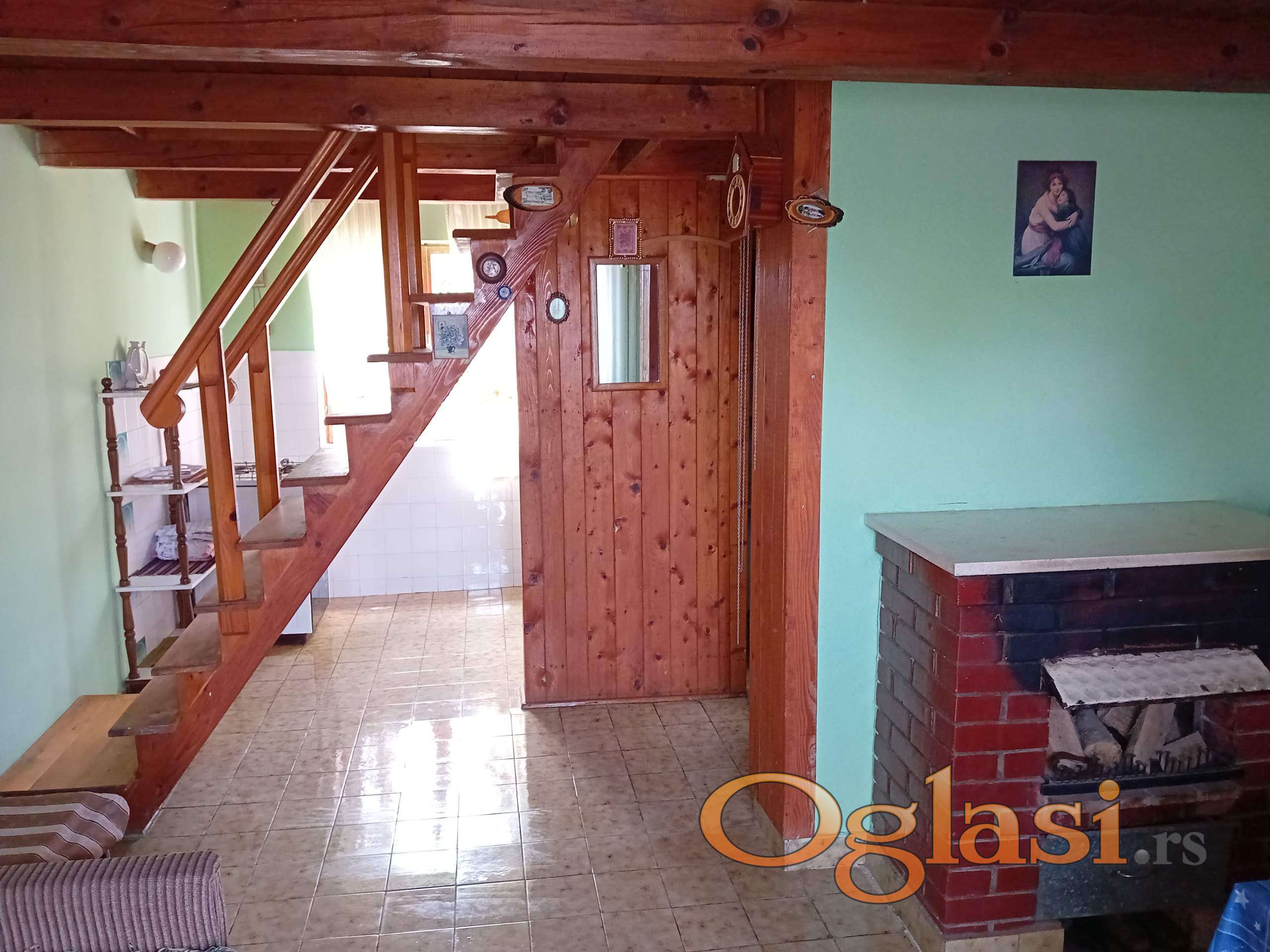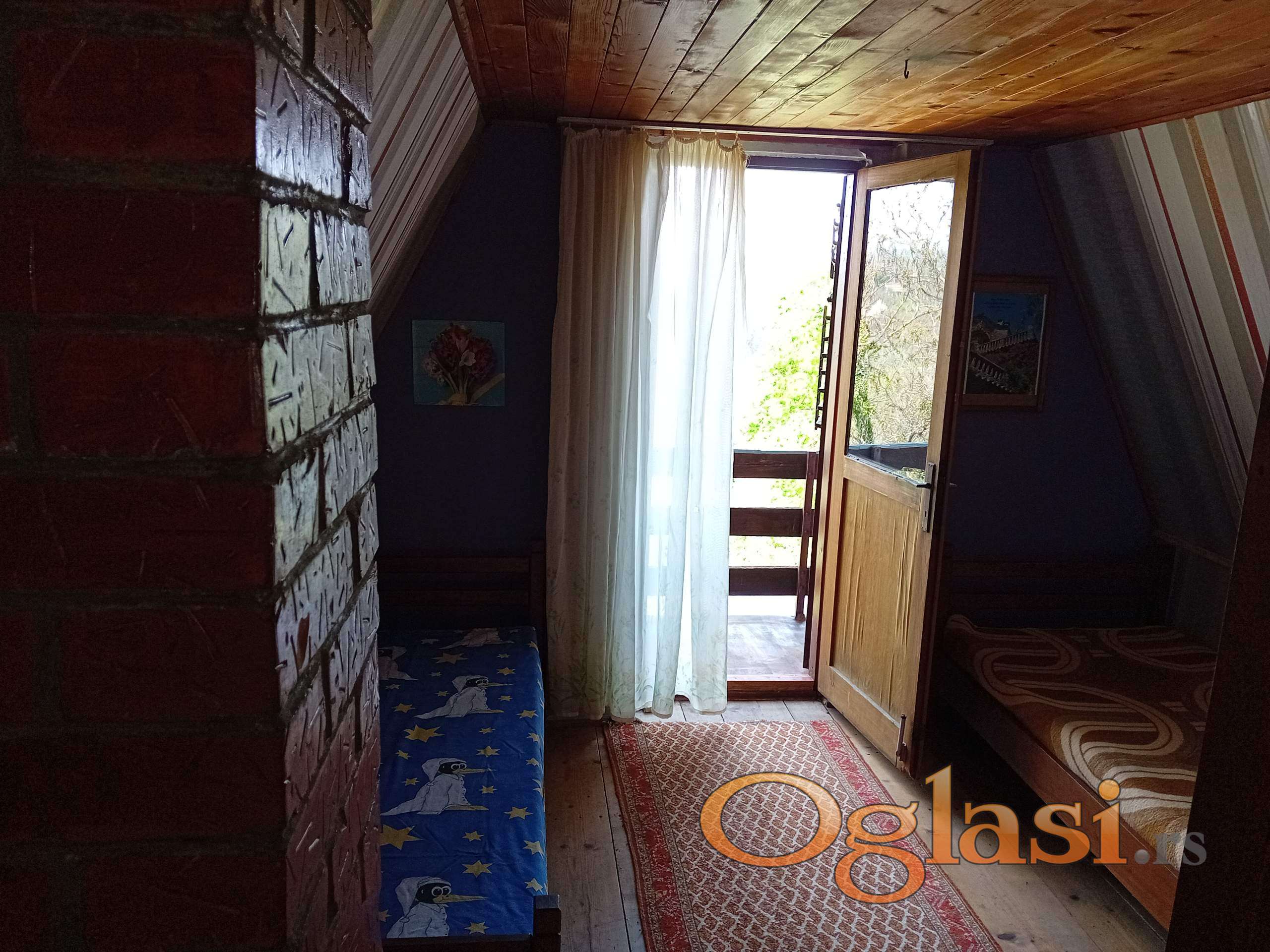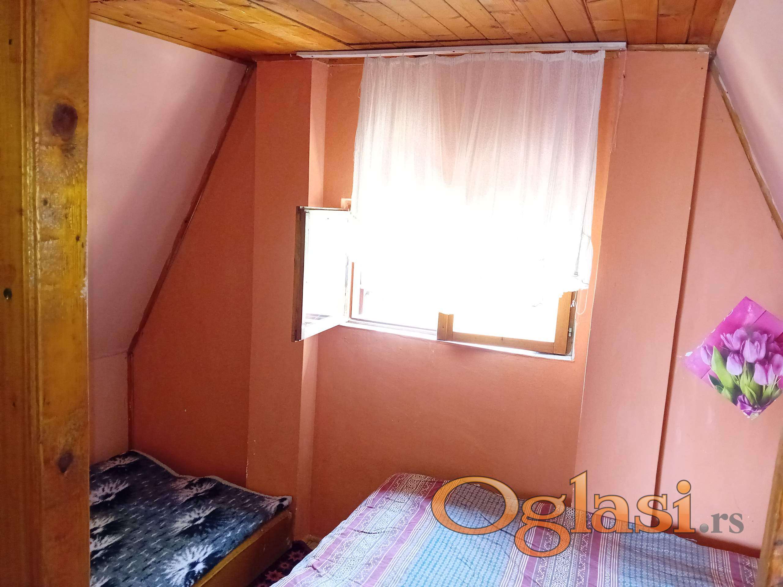 Vikendica je A-frame,čvrste gradnje spoljnjih gabarita 8x7m,ima dva nivoa,prizemlje 24m2+terasa 15m2 ,potkrovlje gde su 2 spavaće sobe ukupno 18m2+terasa 6m2.Kuhinja,kupatilo,kamin.U vikendici je sprovedena el.instalacija ali nije priključena na mrežu.