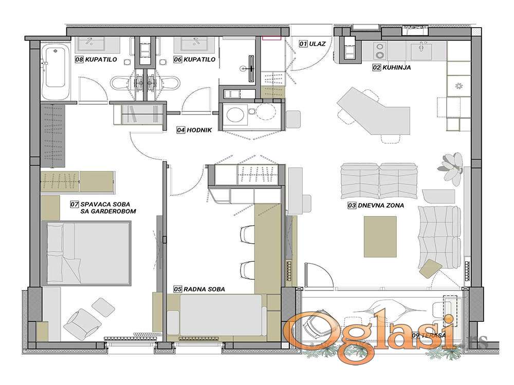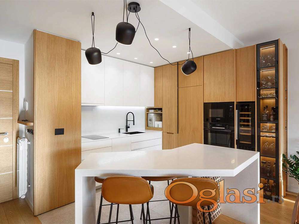 Enterijer je opremljen nameštajem vrhunskog kvaliteta domaćih brendova, uz autorske elemente rađene po meri, koji prostoru daju poseban identitet i toplinu.