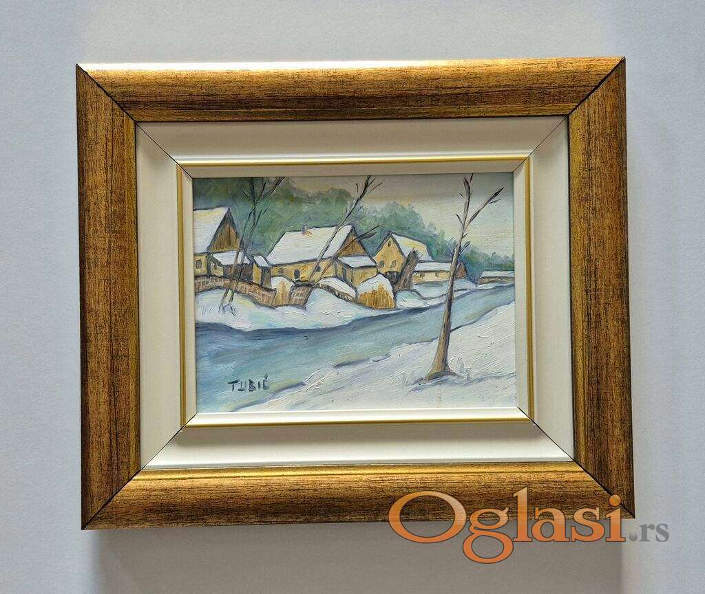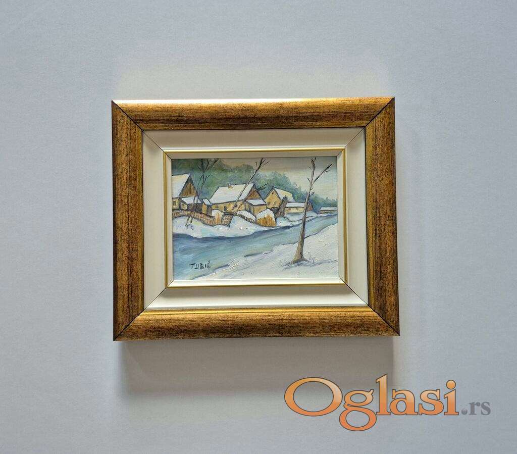 Ulje na lesonitu Selo 12, minijatura. Prelepo umetnicko delo. Slika je uramljena u jako lep ram, dimenzije slike sa ramom 31 x 27. Privatna kolekcija.