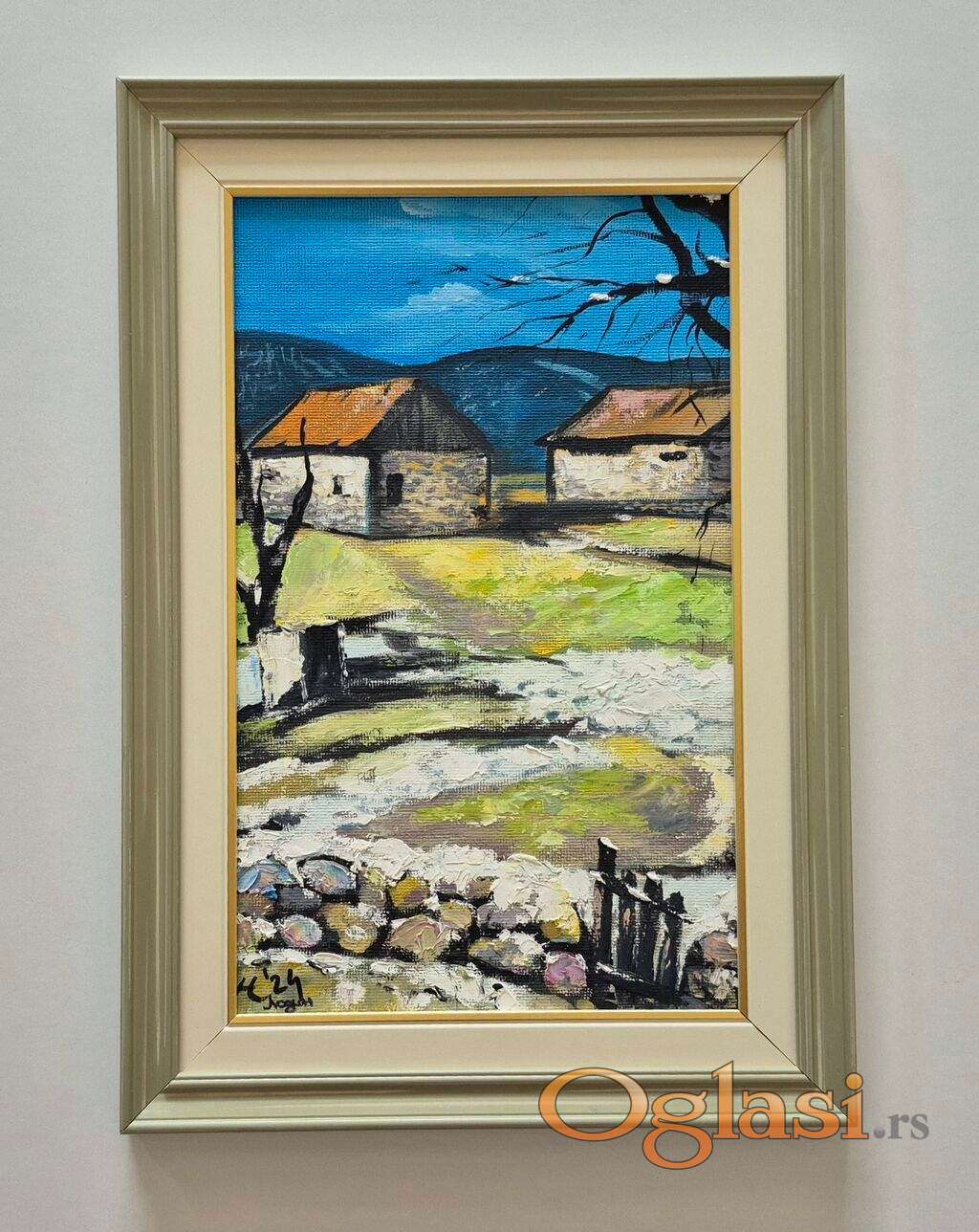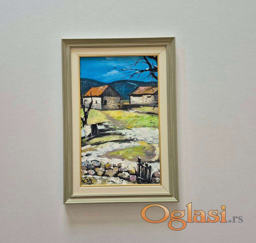 Ulje na platnu Kuce u selu 2, prelepo umetnicko delo. Slika je uramljena u jako lep ram, dimenzije slike sa ramom 50 x 35. Privatna kolekcija.