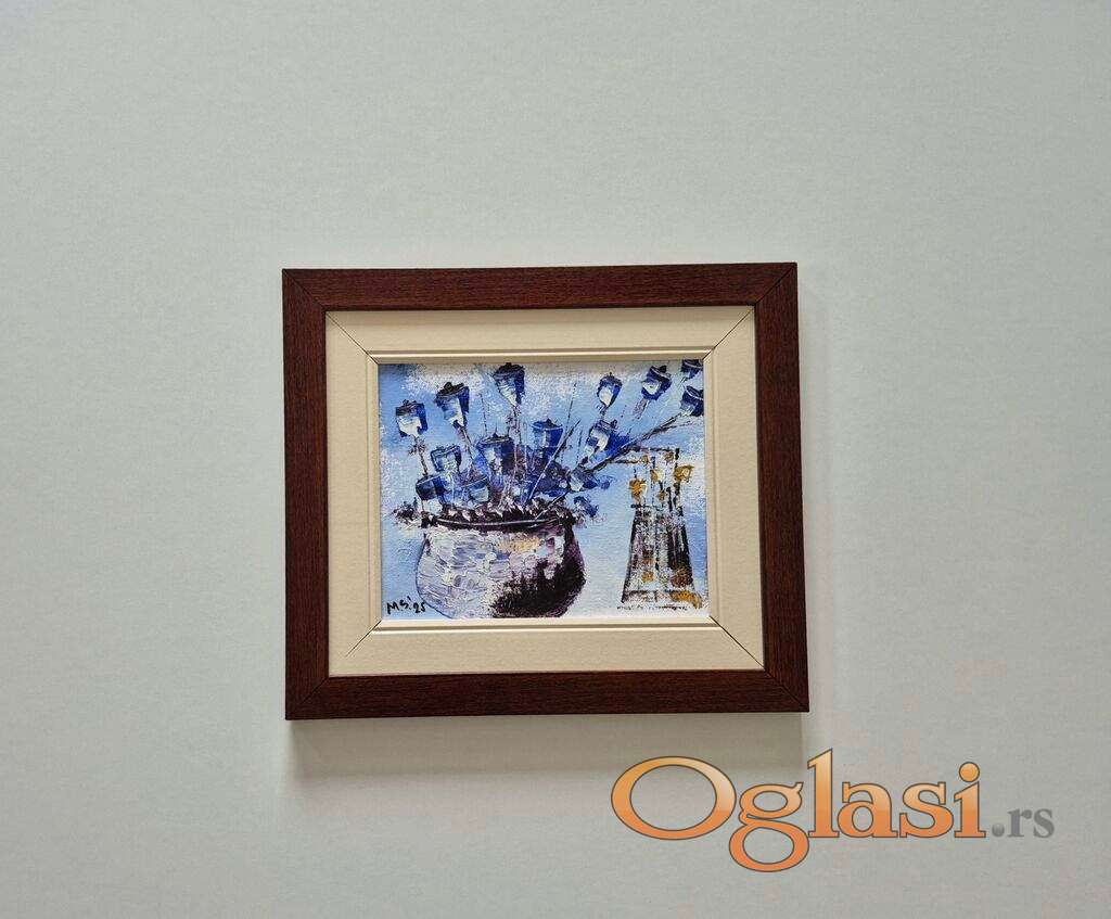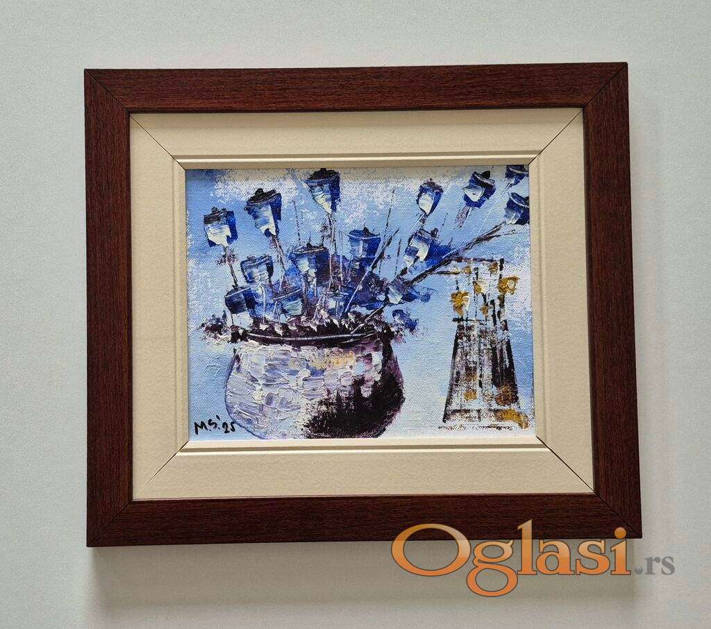 Ulje na platnu Vaza sa plavim cvecem, prelepo umetnicko delo. Slika je uramljena u jako lep ram, dimenzije slike sa ramom 37 x 32. Privatna kolekcija.