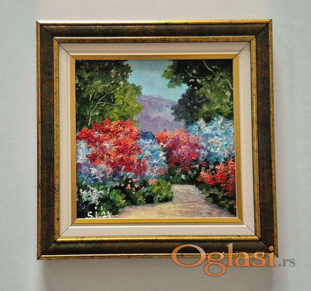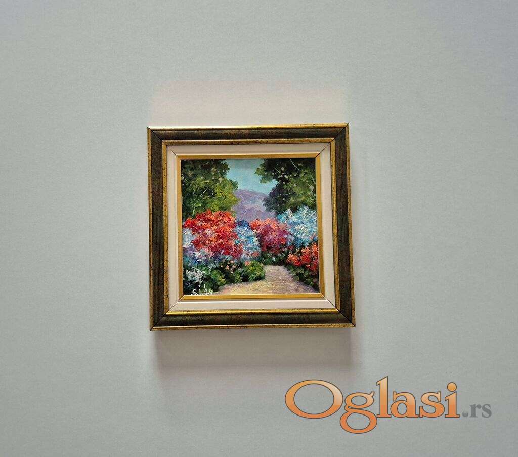 Ulje na medijapanu Mali pejzaz, prelepo umetnicko delo. Slika je uramljena u jako lep ram, dimenzije slike sa ramom 25 x 25. Privatna kolekcija.