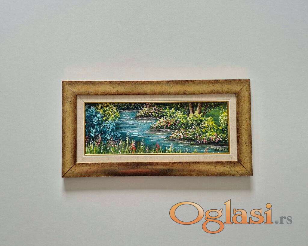 Ulje na lesonitu Zubor male reke, prelepo umetnicko delo. Slika je uramljena u jako lep ram, dimenzije slike sa ramom 51 x 26. Privatna kolekcija.