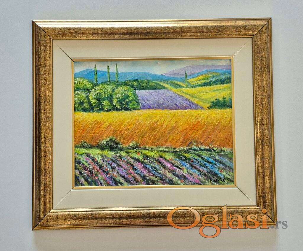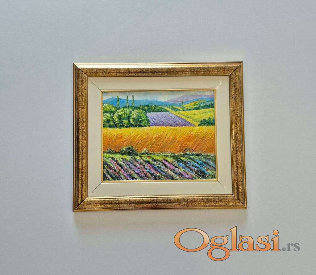 Ulje na platnu Zlatni pejzaz, prelepo umetnicko delo. Slika je uramljena u jako lep ram, dimenzije slike sa ramom 45 x 38. Privatna kolekcija.