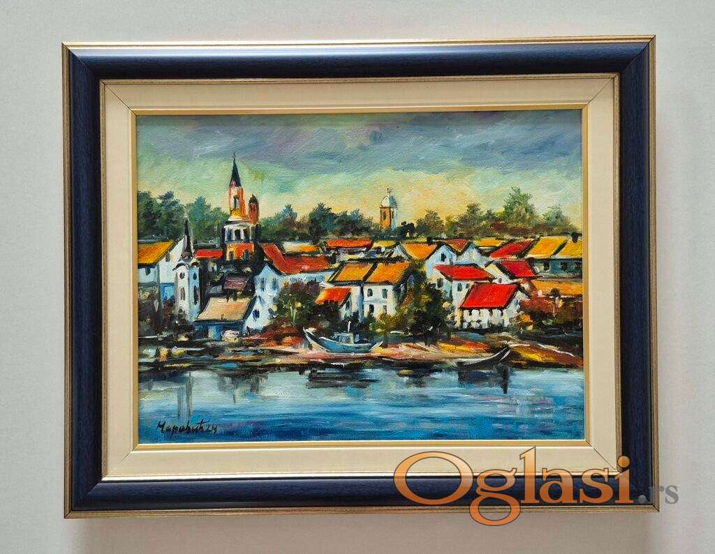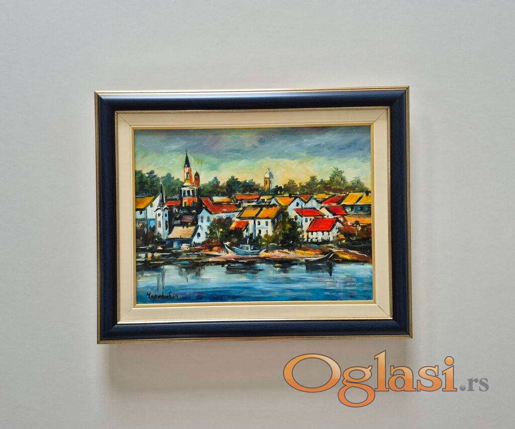Ulje na platnu Jedan grad uz reku, prelepo umetnicko delo. Slika je uramljena u jako lep ram, dimenzije slike sa ramom 52 x 42. Privatna kolekcija.