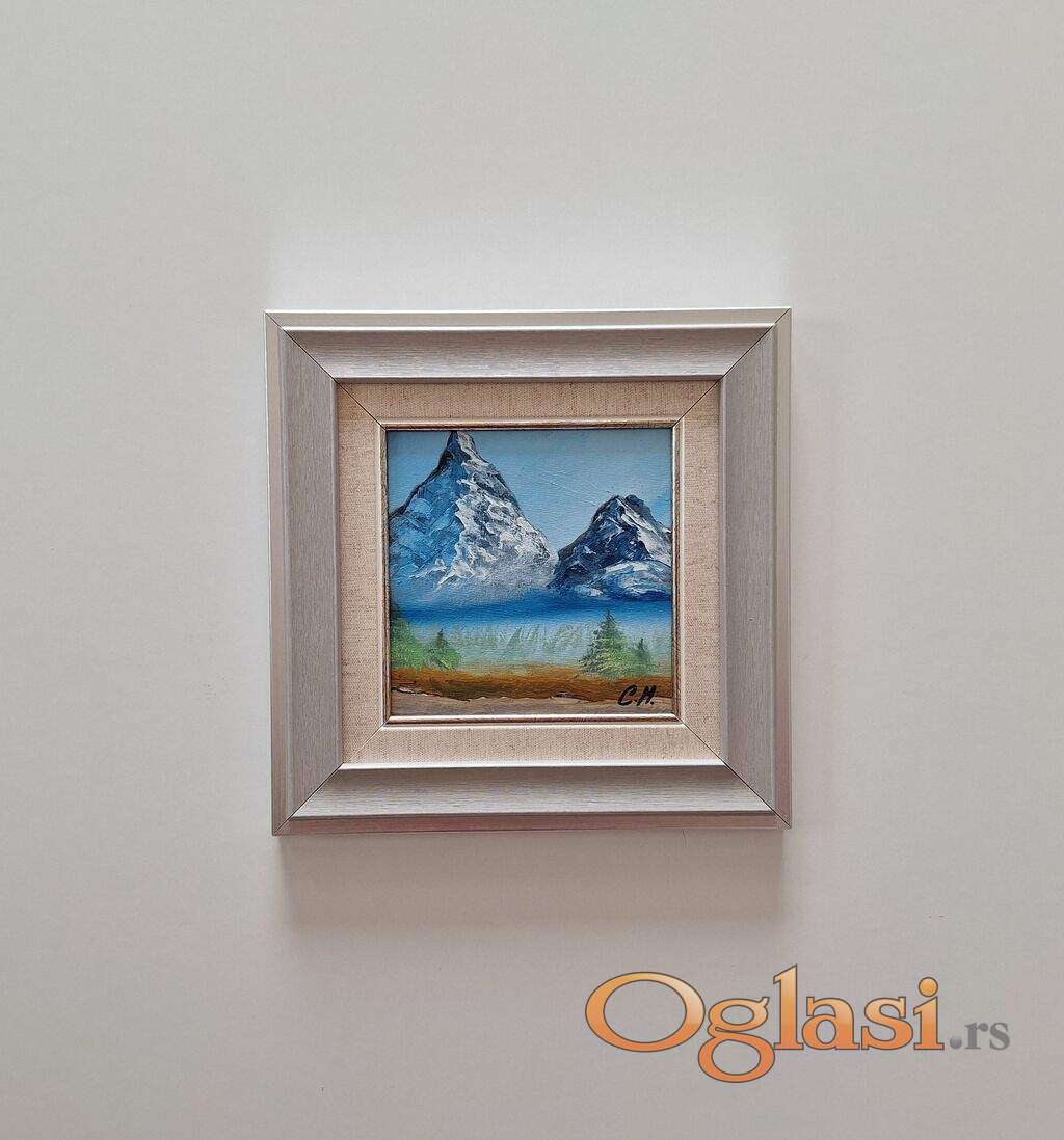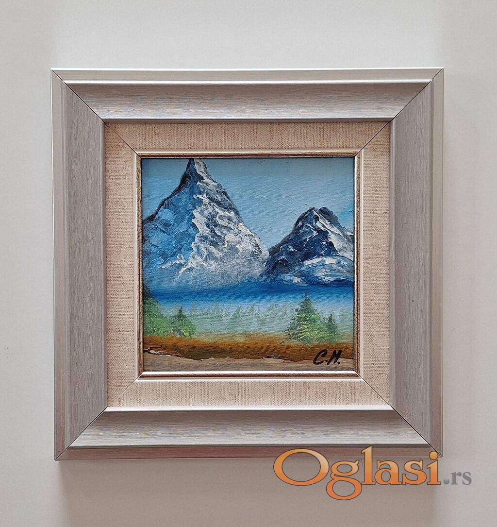 Ulje na kartonu Dve planine, minijatura. Prelepo umetnicko delo. Slika je uramljena u jako lep ram, dimenzije slike sa ramom 26 x 26. Privatna kolekcija.