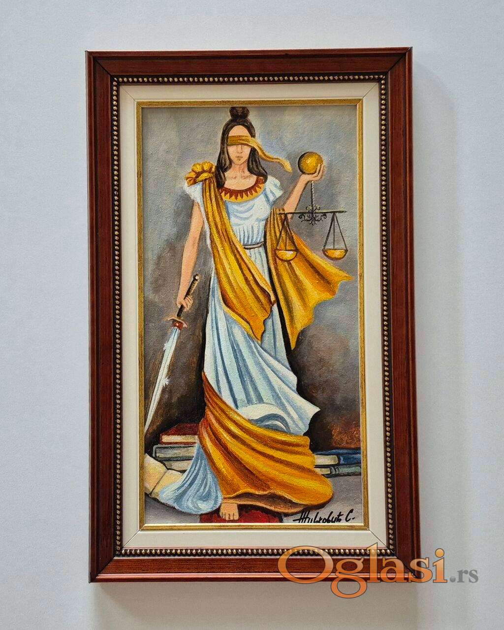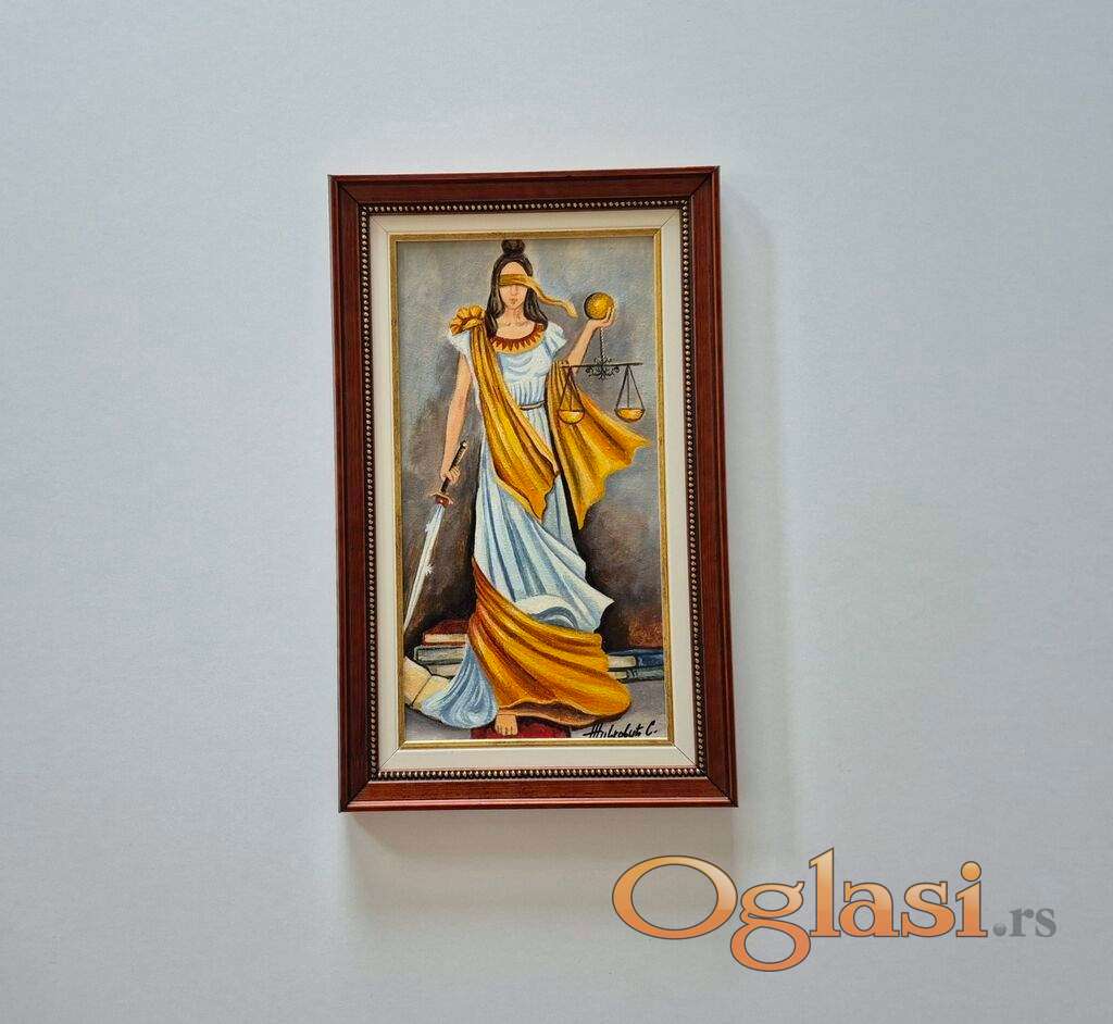 Ulje na platnu Boginja pravde, prelepo umetnicko delo. Slika je uramljena u jako lep ram, dimenzije slike sa ramom 46 x 28. Privatna kolekcija.
