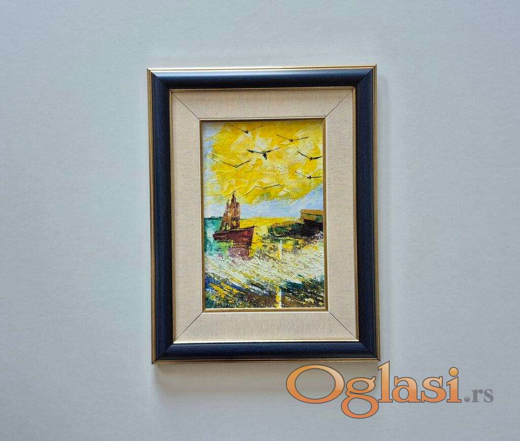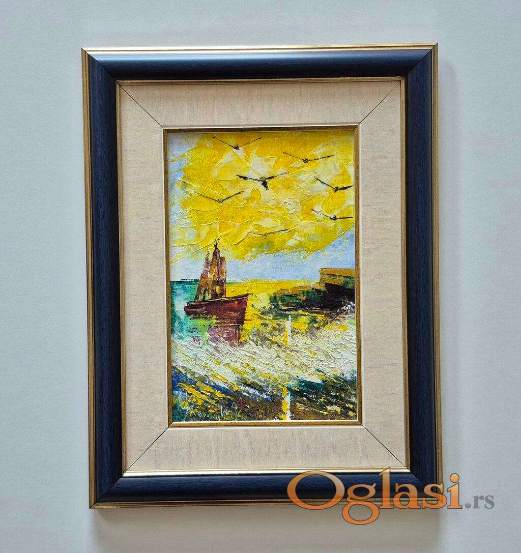 Ulje na platnu More, brod i ptice. Prelepo umetnicko delo. Slika je uramljena u jako lep ram, dimenzije slike sa ramom 46 x 36. Privatna kolekcija.