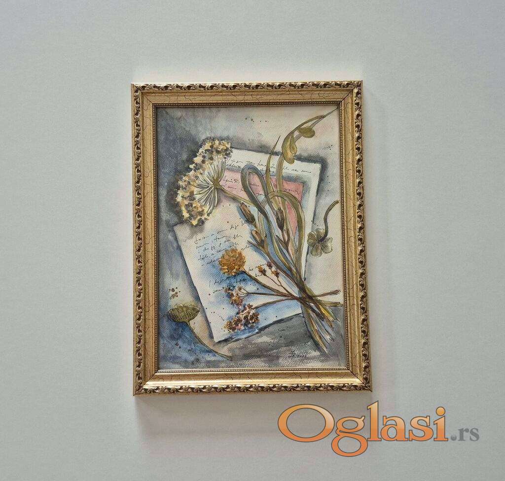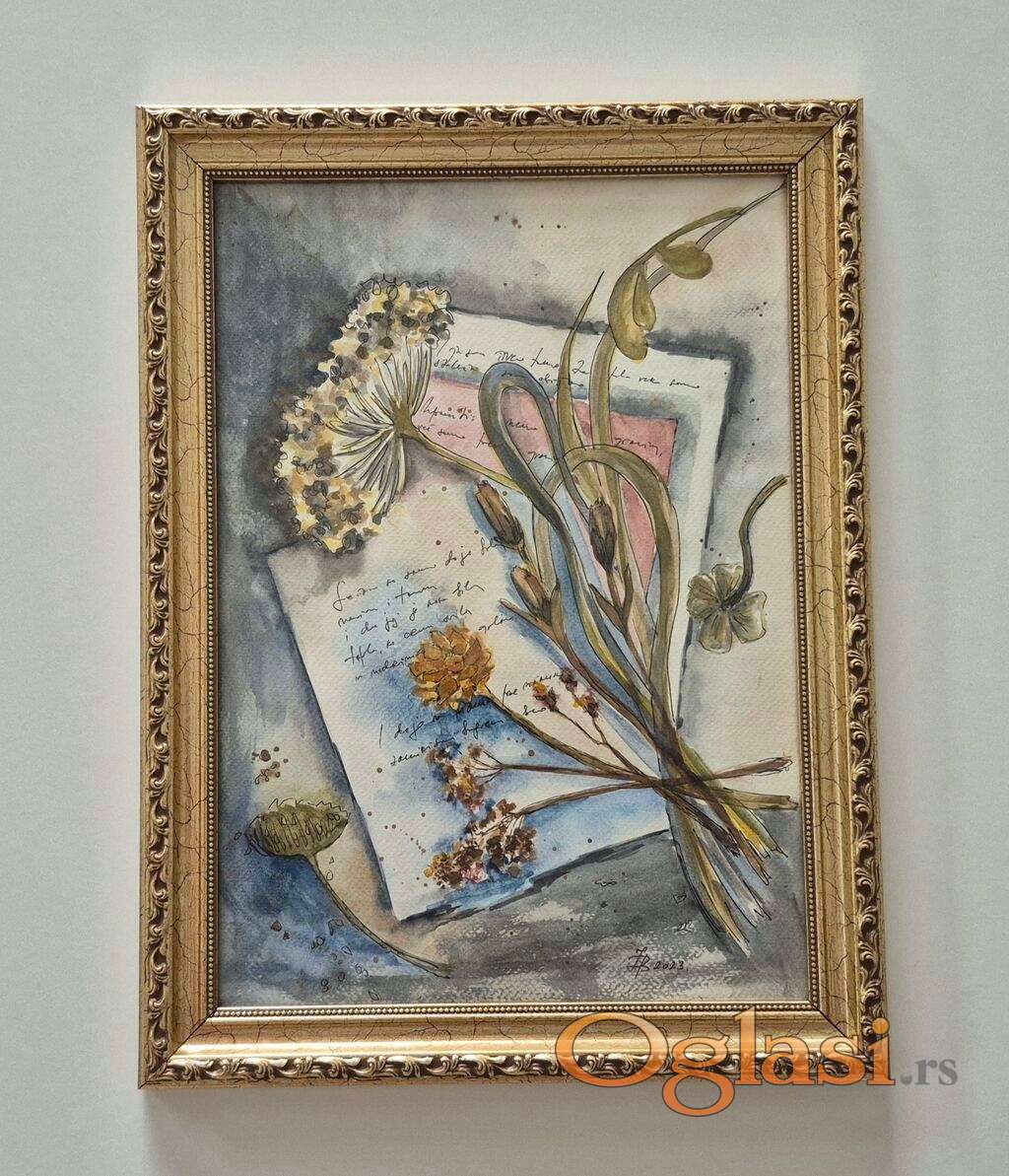 Slika Uspomene, tehnika akvarel. Prelepo umetnicko delo. Slika je uramljena u jako lep ram, dimenzije slike sa ramom 41 x 31. Privatna kolekcija.