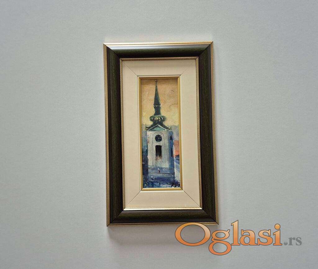 Slika Crkva, tehnika akvarel. Minijatura. Slika je uramljena u jako lep ram, dimenzije slike sa ramom 38 x 24. Privatna kolekcija.