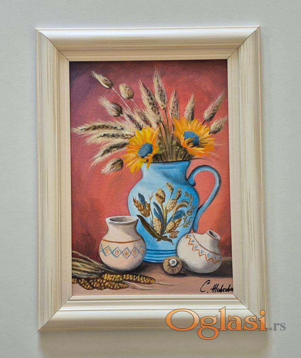 Ulje na platnu Plavi bokal sa cvecem, prelepo umetnicko delo. Slika je uramljena u jako lep ram, dimenzije slike sa ramom 50 x 38. Privatna kolekcija.
