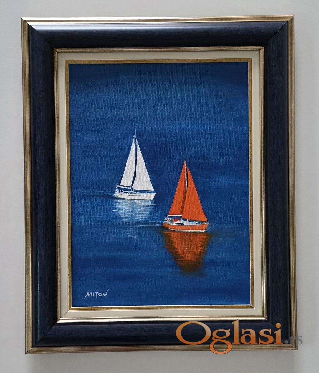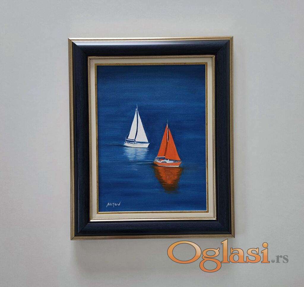Ulje na platnu Na plavom moru, prelepo umetnicko delo. Slika je uramljena u jako lep ram, dimenzije slike sa ramom 55 x 45. Privatna kolekcija.