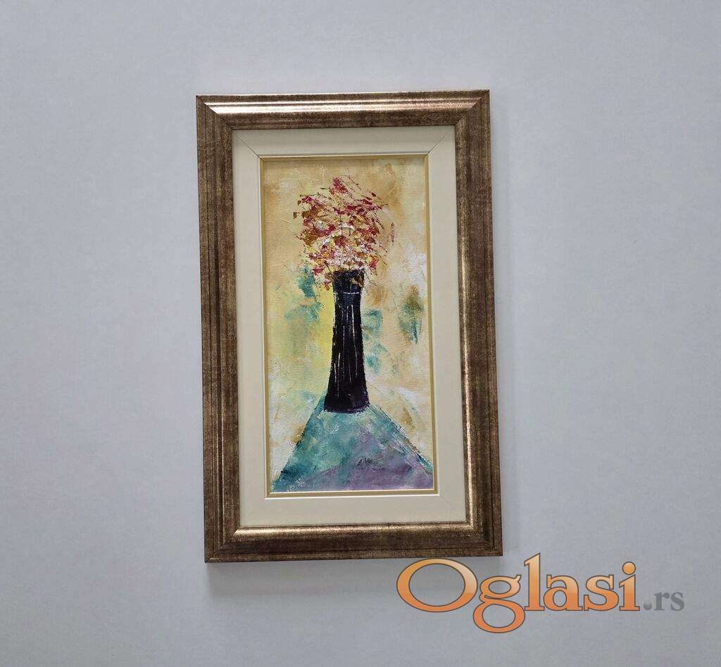 Ulje na platnu Vaza sa cvecem, prelepo umetnicko delo. Slika je uramljena u jako lep ram, dimenzije slike sa ramom 55 x 35. Privatna kolekcija.