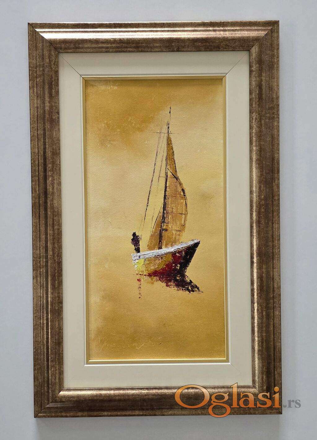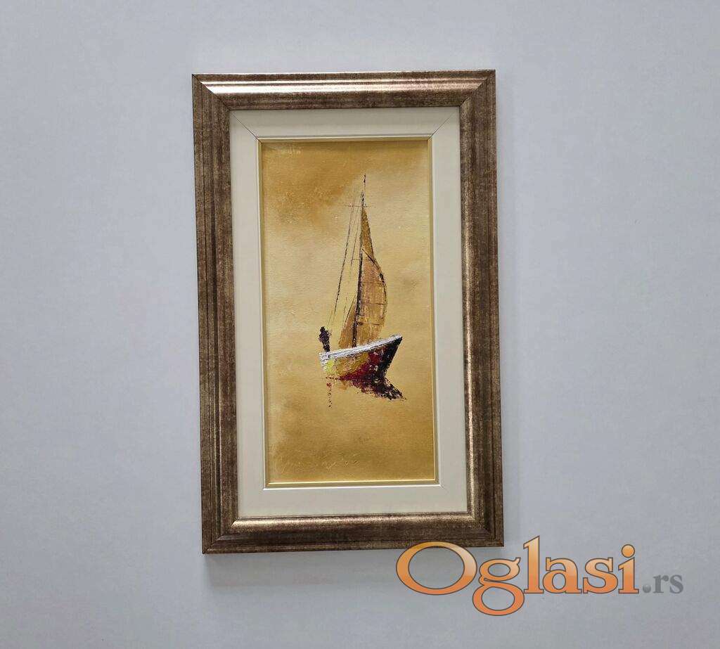 Ulje na platnu Jedrenje uz suton, prelepo umetnicko delo. Slika je uramljena u jako lep ram, dimenzije slike sa ramom 55 x 35. Privatna kolekcija.
