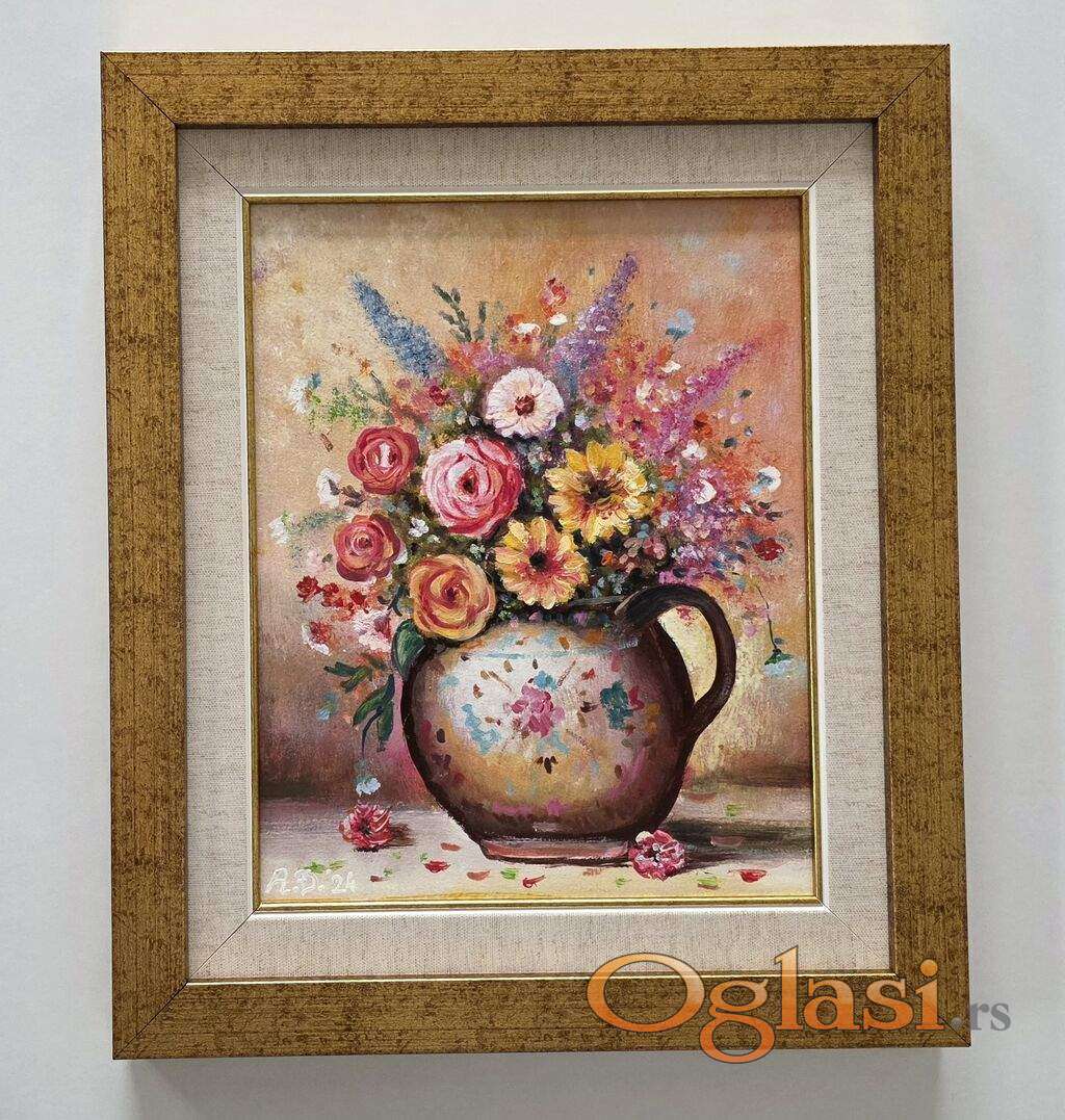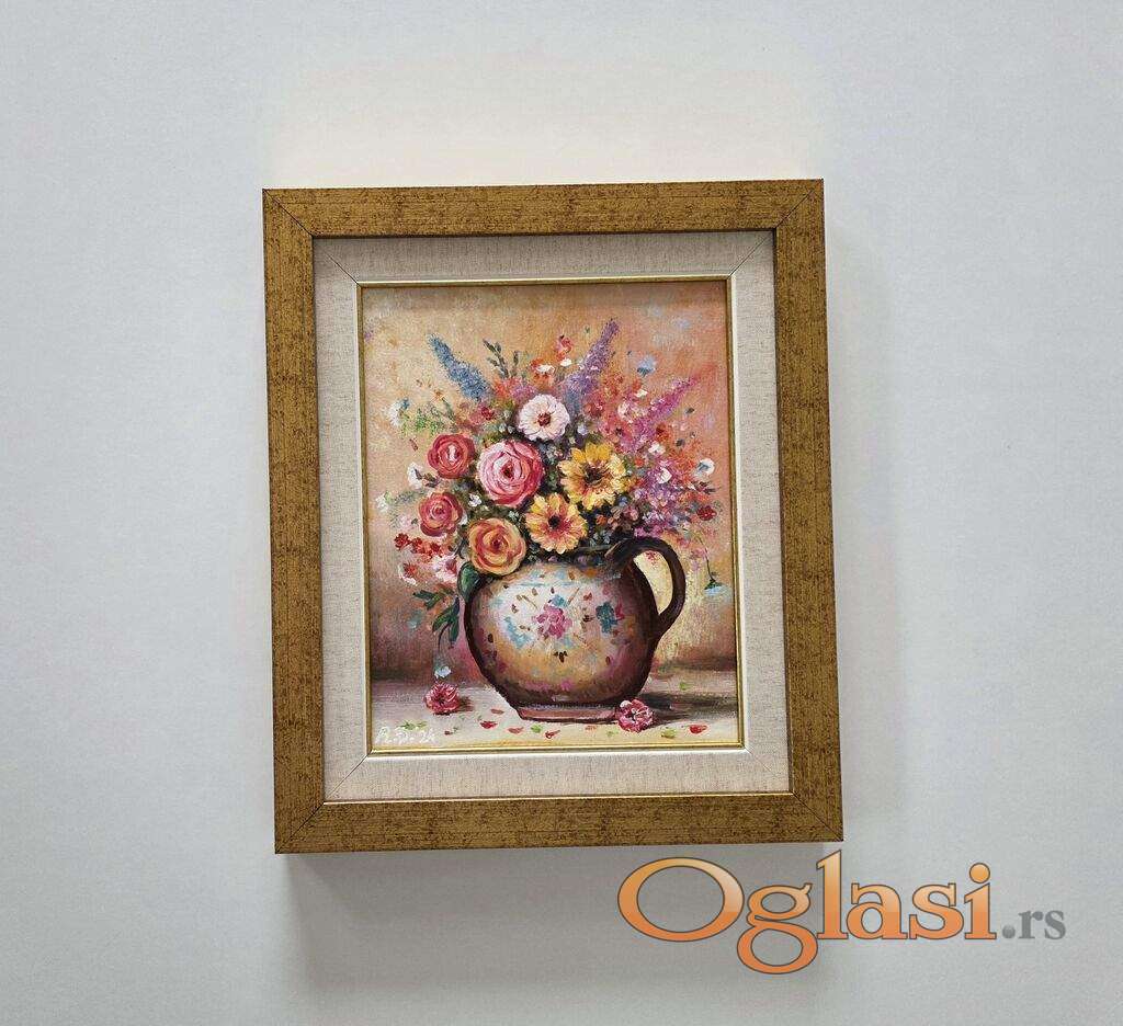 Ulje na lesonitu Cup sa cvecem, prelepo umetnicko delo. Slika je uramljena u jako lep ram, dimenzije slike sa ramom 41 x 35. Privatna kolekcija.