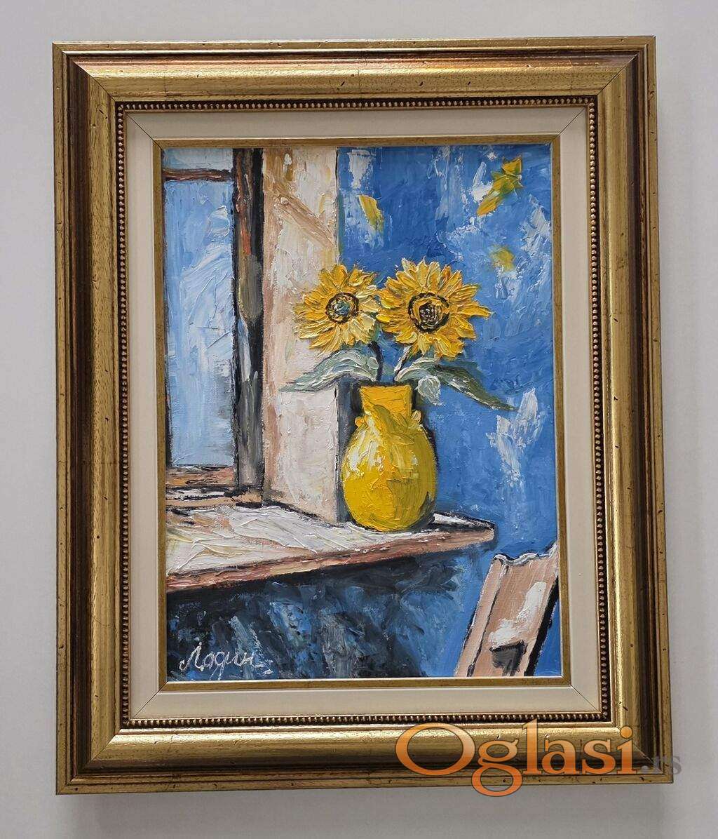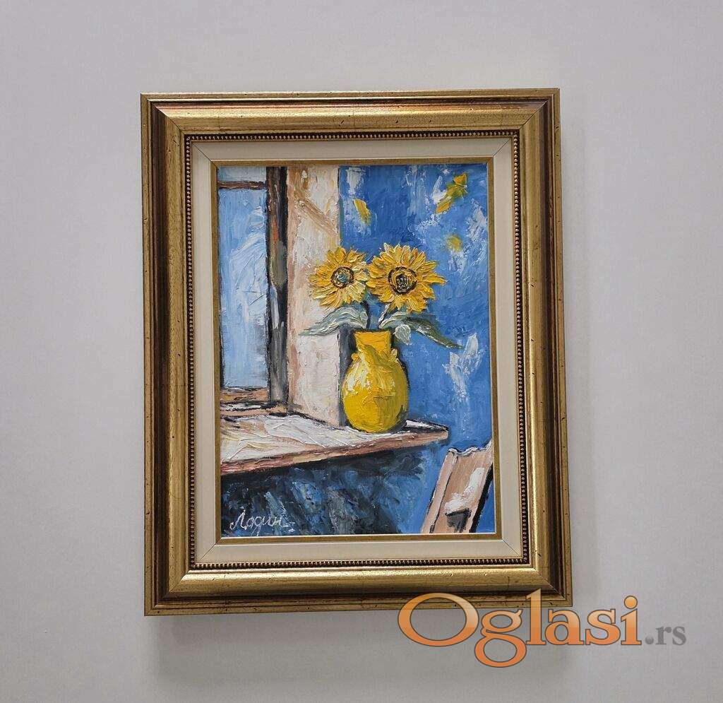 Ulje na platnu Suncokreti na prozoru, prelepo umetnicko delo. Slika je uramljena u jako lep ram, dimenzije slike sa ramom 56 x 46. Privatna kolekcija.