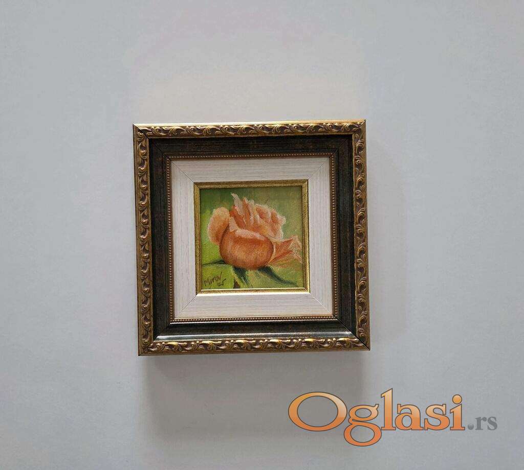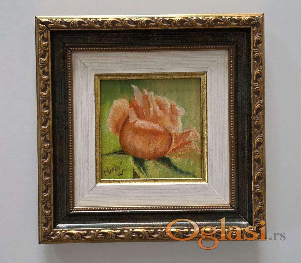 Ulje na platnu Ruza, jedan. Minijatura. Prelepo umetnicko delo. Slika je uramljena u jako lep ram, dimenzije slike sa ramom 21 x 21. Privatna kolekcija.