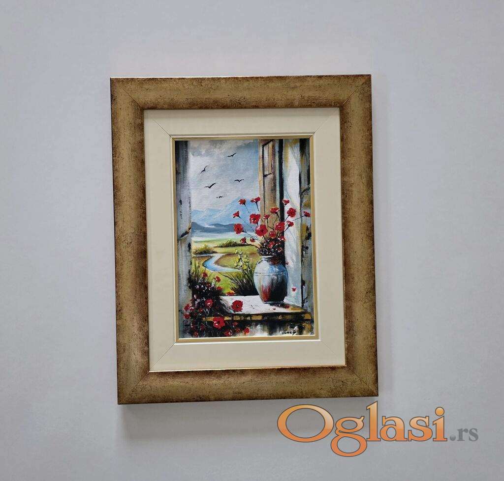 Slika Cvece na prozoru, tehnika akril na platnu. Prelepo umetnicko delo. Slika je uramljena u jako lep ram, dimenzije slike sa ramom 41 x 33. Privatna kolekcija.