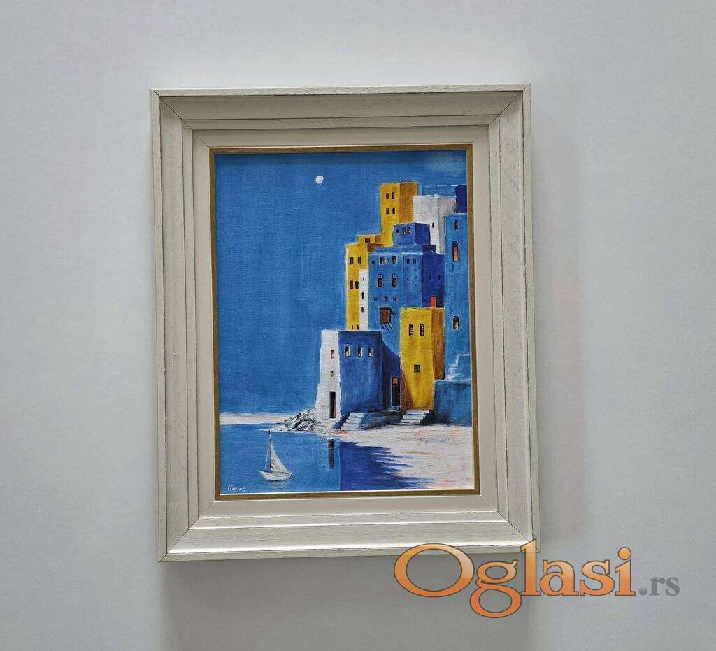 Slika Meseceva luka, tehnika akril na platnu. Prelepo umetnicko delo. Slika je uramljena u jako lep ram, dimenzije slike sa ramom 54 x 44. Privatna kolekcija.