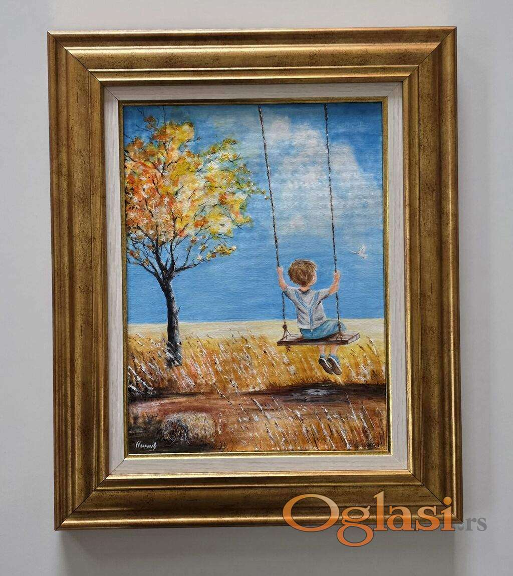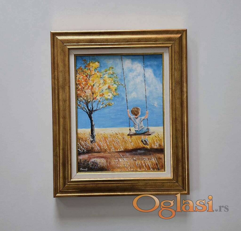 Slika Na krilima jeseni, tehnika akril na platnu. Prelepo umetnicko delo. Slika je uramljena u jako lep ram, dimenzije slike sa ramom 56 x 46. Privatna kolekcija.