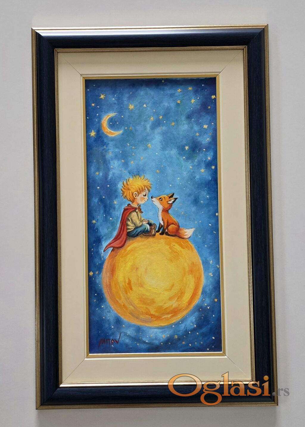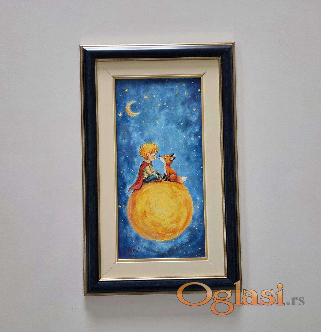 Ulje na platnu Svet malog princa, prelepo umetnicko delo. Slika je uramljena u jako lep ram, dimenzije slike sa ramom 55 x 35. Privatna kolekcija.