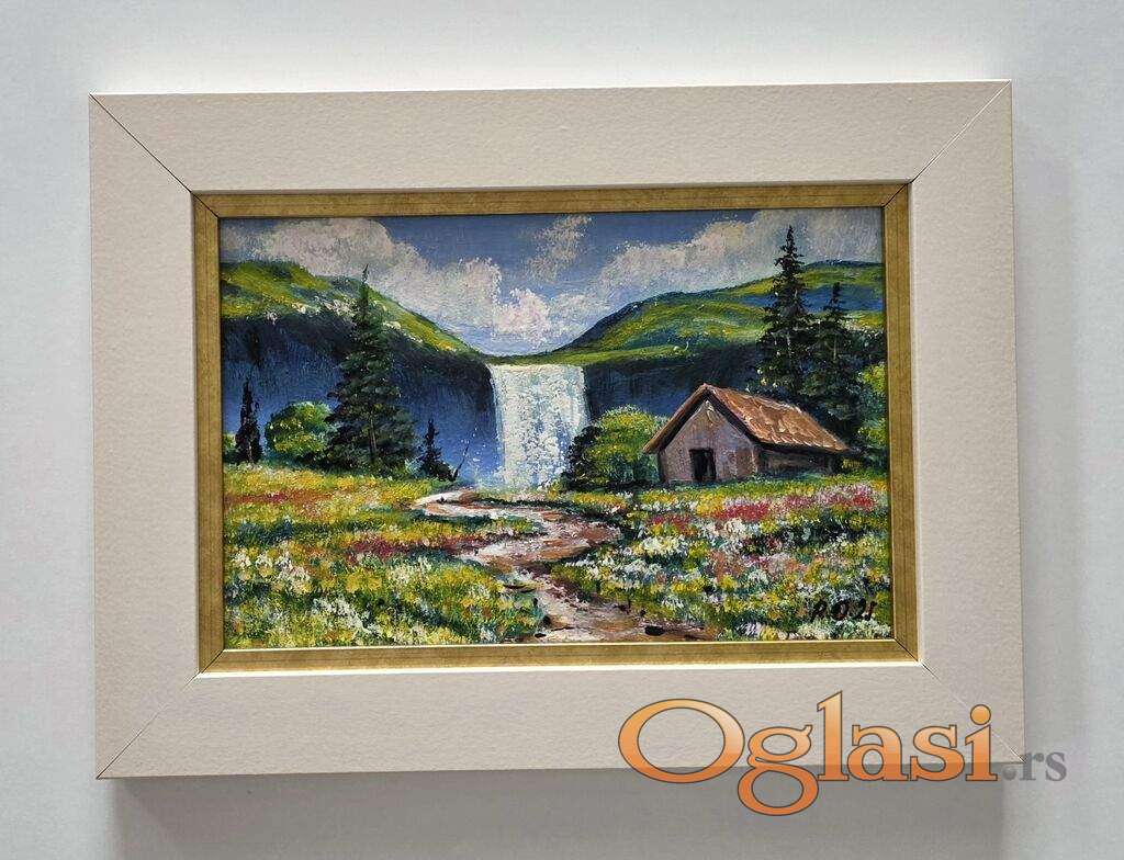 Ulje na lesonitu Kuca kraj vodopada, prelepo umetnicko delo. Slika je uramljena u jako lep ram, dimenzije slike sa ramom 38 x 28. Privatna kolekcija.