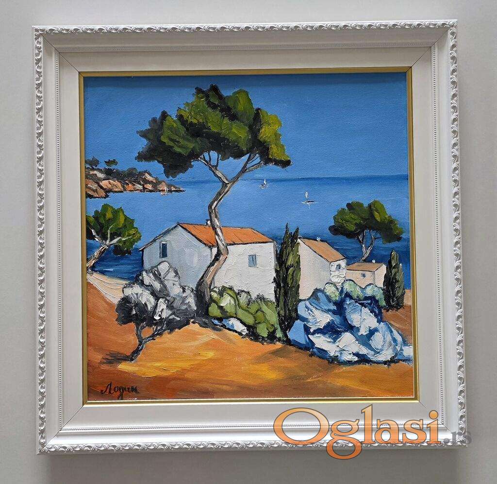Ulje na platnu Plavi horizont, prelepo umetnicko delo. Slika je uramljena u jako lep ram, dimenzije slike sa ramom 52 x 52. Privatna kolekcija.