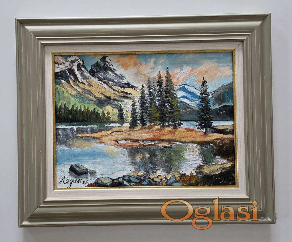 Ulje na platnu U zagrljaju planina, prelepo umetnicko delo. Slika je uramljena u jako lep ram, dimenzije slike sa ramom 56 x 46. Privatna kolekcija.