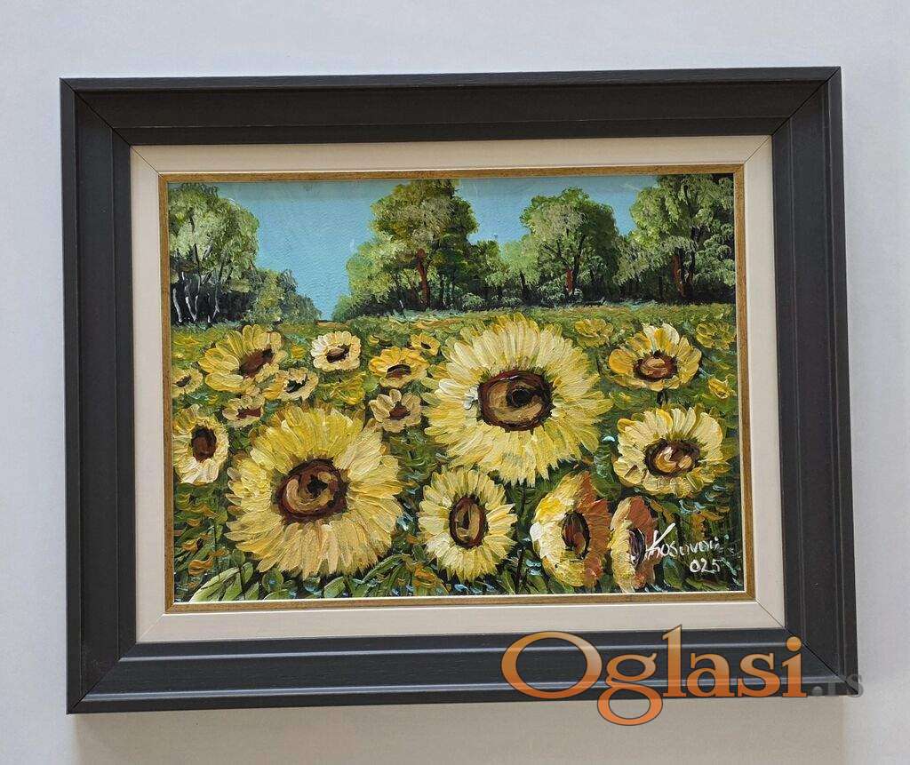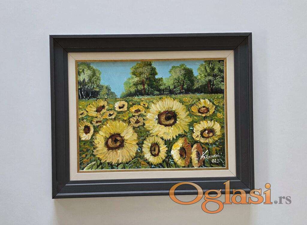 Ulje na platnu Ples suncokreta, prelepo umetnicko delo. Slika je uramljena u jako lep ram, dimenzije slike sa ramom 54 x 44. Privatna kolekcija.