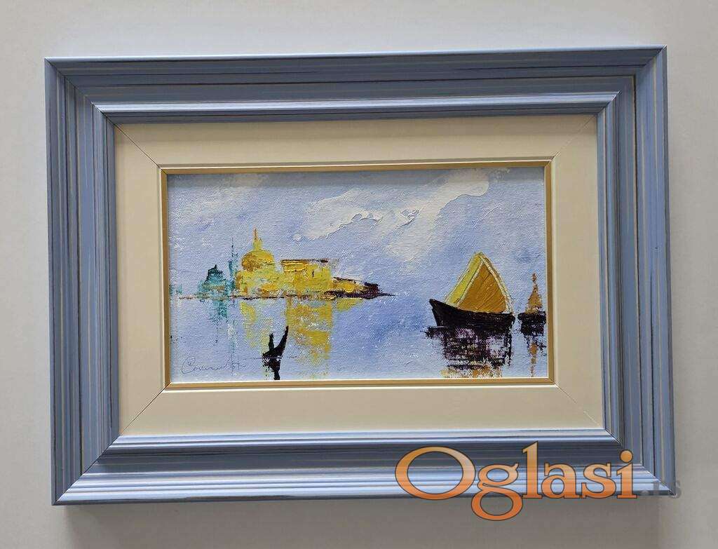 Ulje na platnu Pogled na Veneciju, prelepo umetnicko delo. Slika je uramljena u jako lep ram, dimenzije slike sa ramom 45 x 32. Privatna kolekcija.