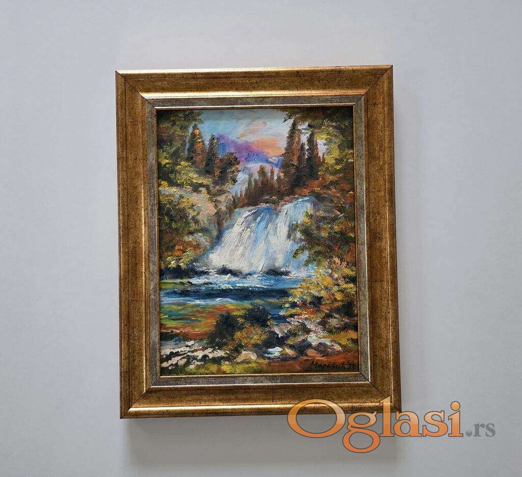 Ulje na platnu Jesenji slap, prelepo umetnicko delo. Slika je uramljena u jako lep ram, dimenzije slike sa ramom 51 x 41. Privatna kolekcija.