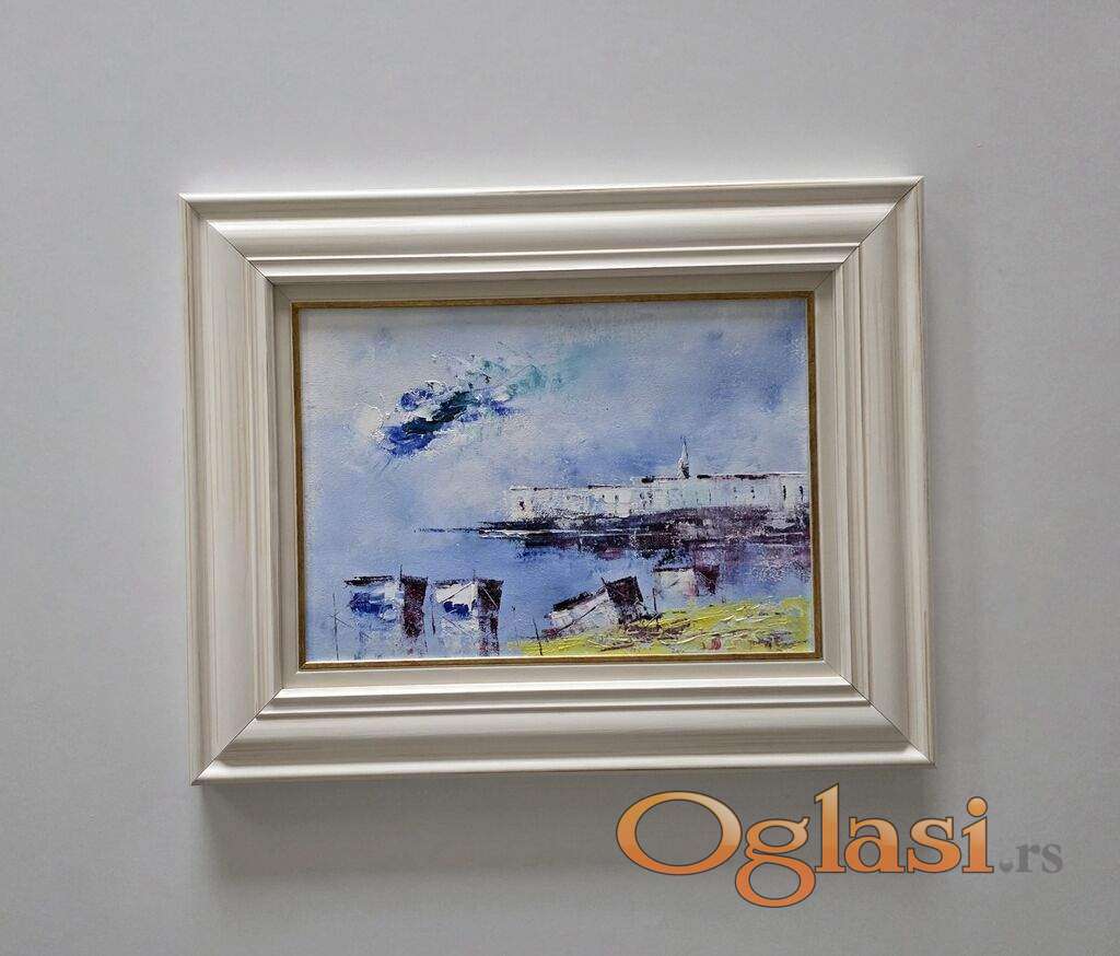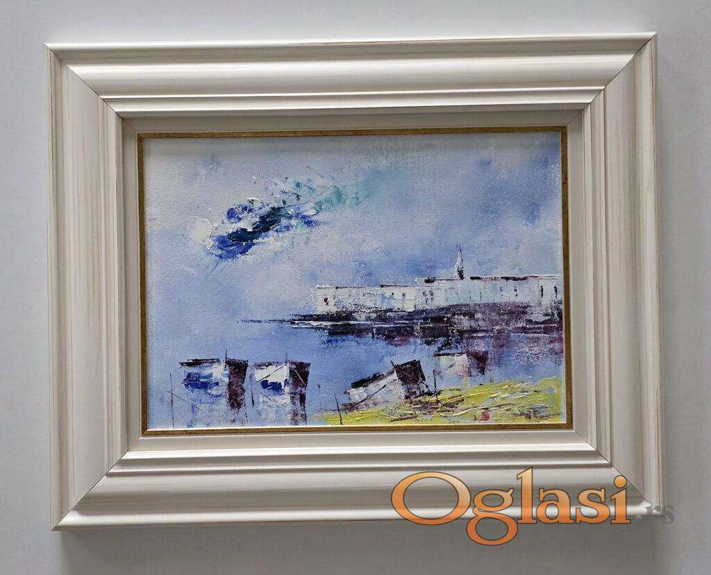 Ulje na platnu Jutro nad obalom, prelepo umetnicko delo. Slika je uramljena u jako lep ram, dimenzije slike sa ramom 50 x 40. Privatna kolekcija.