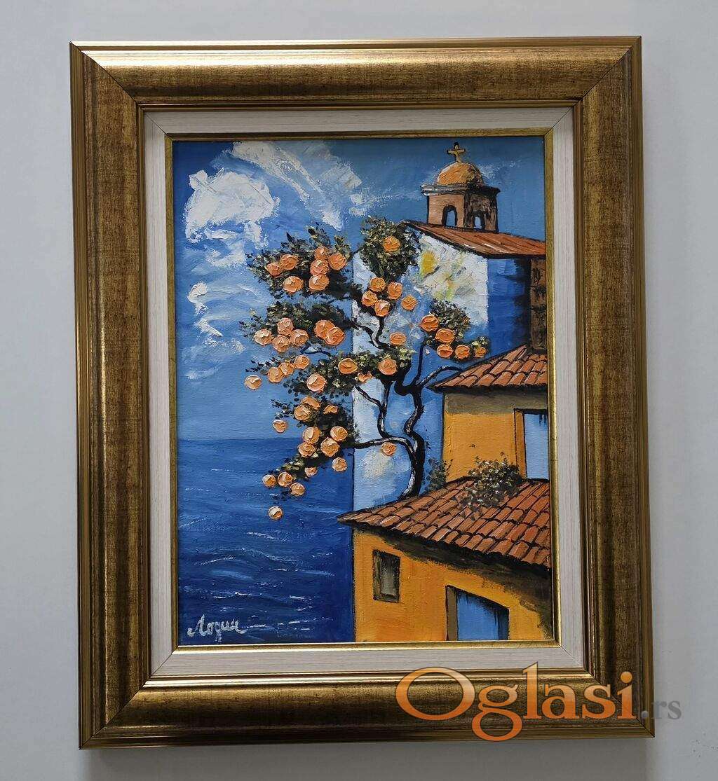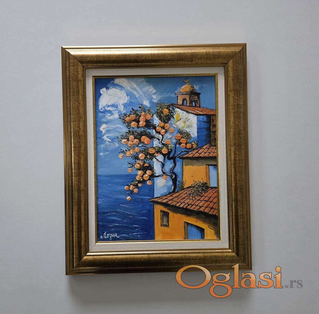Ulje na platnu Kuca na ivici mora, prelepo umetnicko delo. Slika je uramljena u jako lep ram, dimenzije slike sa ramom 56 x 46. Privatna kolekcija.