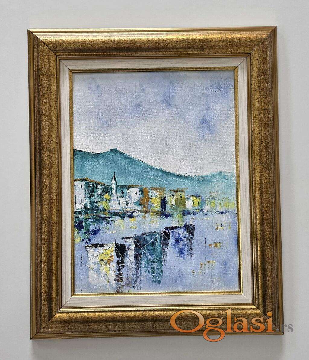 Ulje na platnu Grad pod planinom, prelepo umetnicko delo. Slika je uramljena u jako lep ram, dimenzije slike sa ramom 56 x 46. Privatna kolekcija.