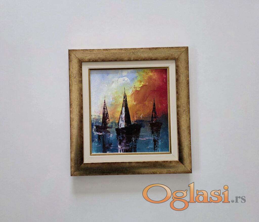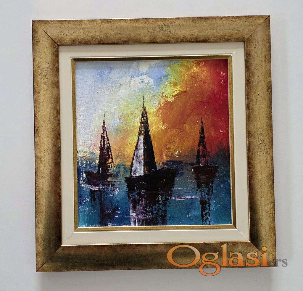 Ulje na platnu Crveno nebo, mirna luka. Prelepo umetnicko delo. Slika je uramljena u jako lep ram, dimenzije slike sa ramom 39 x 37. Privatna kolekcija.