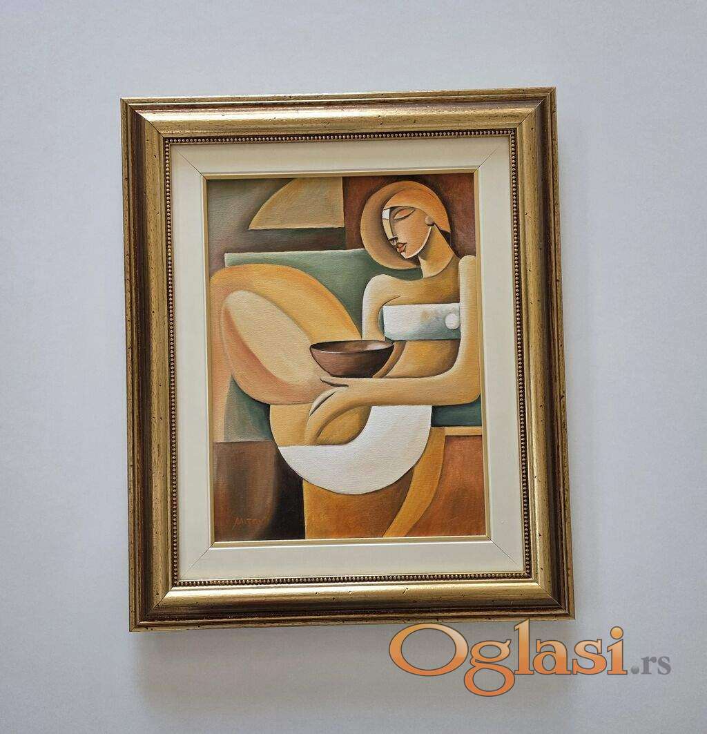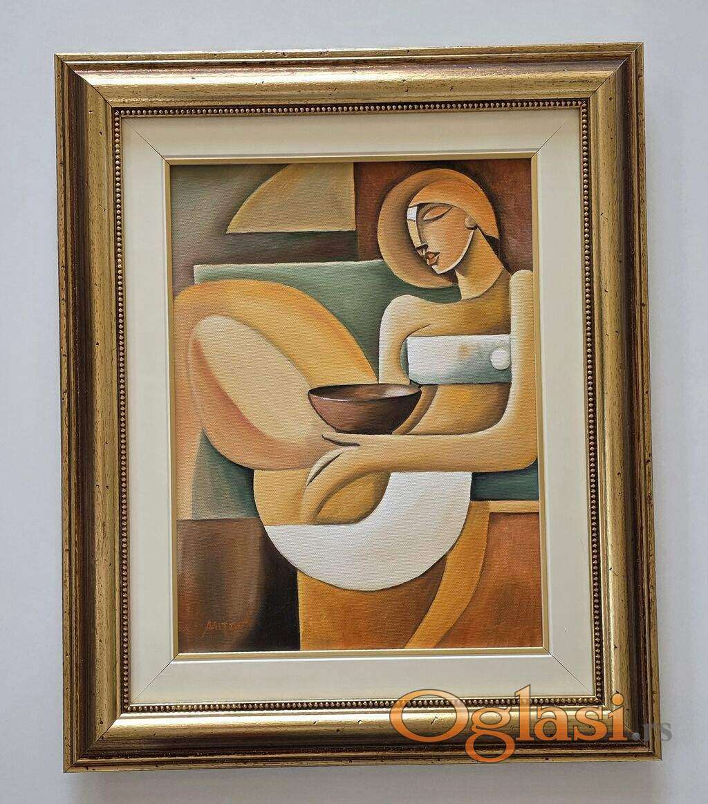 Ulje na platnu Zlatna zamisljenost, prelepo umetnicko delo. Slika je uramljena u jako lep ram, dimenzije slike sa ramom 58 x 48. Privatna kolekcija.