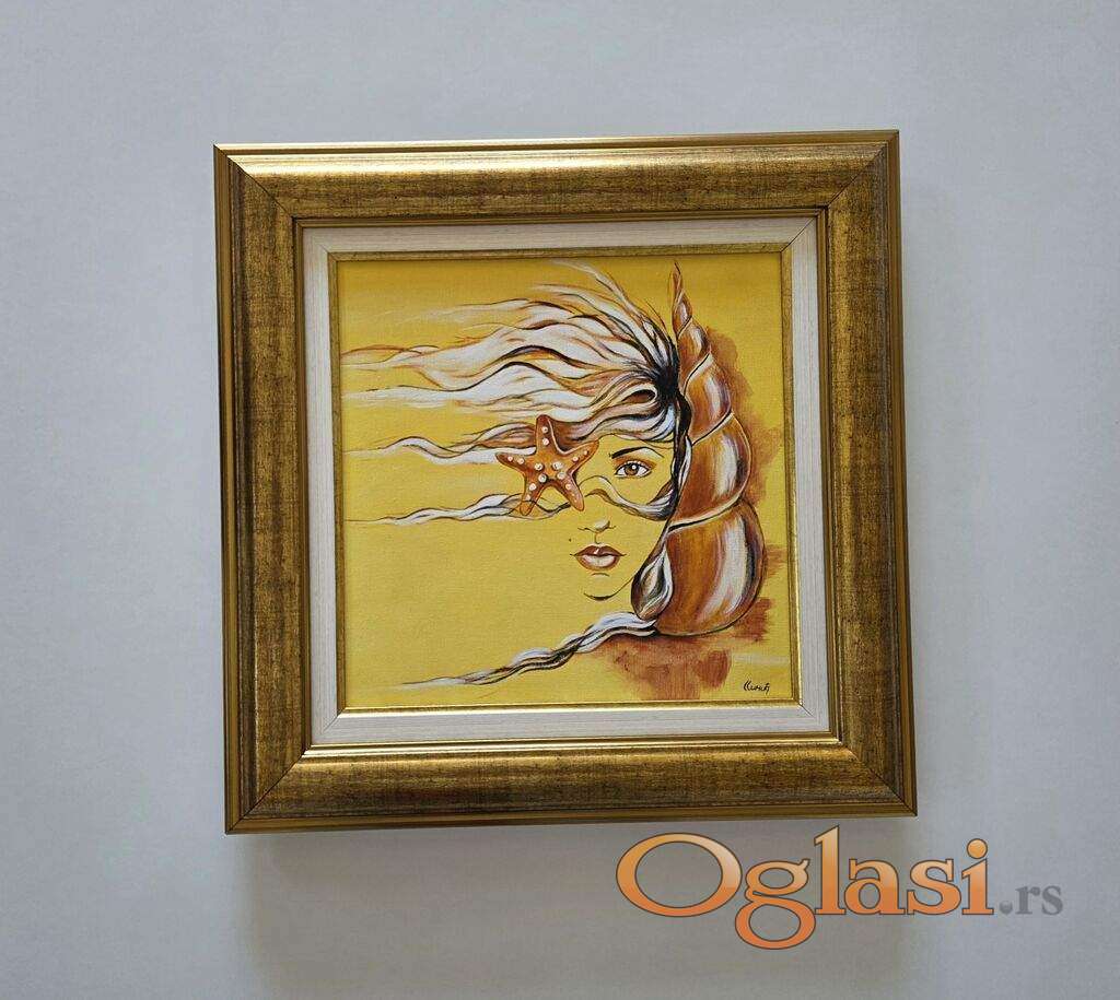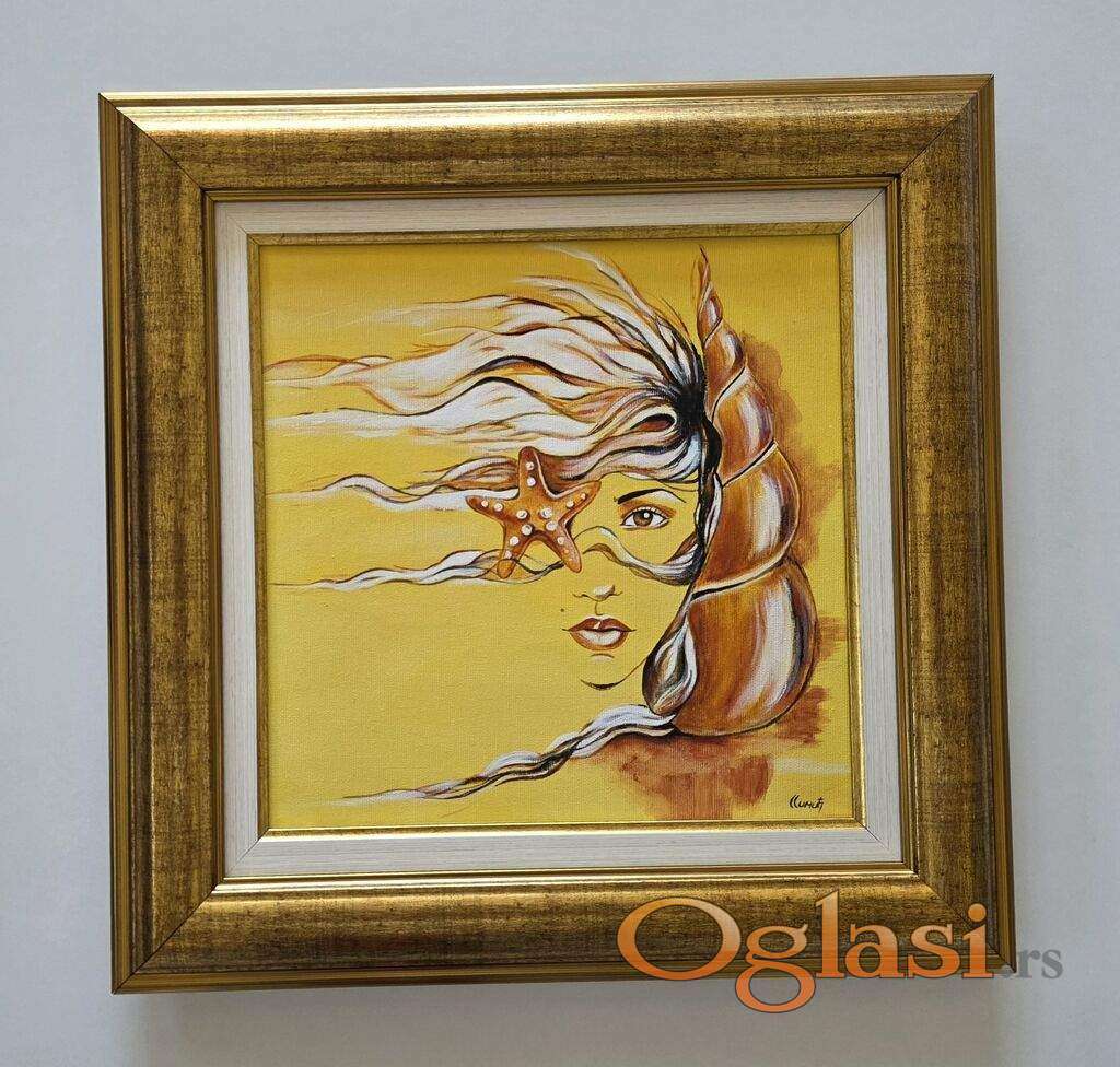 Slika Devojka, zvezda i skoljka. Tehnika akril na platnu. Prelepo umetnicko delo. Slika je uramljena u jako lep ram, dimenzije slike sa ramom 46 x 46. Privatna kolekcija.