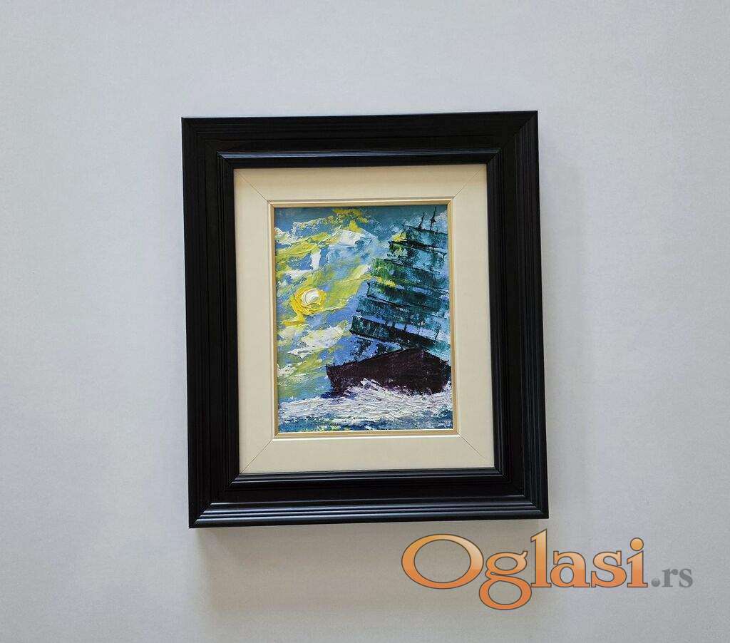 Ulje na platnu Brod ispod nemirnog neba, prelepo umetnicko delo. Slika je uramljena u jako lep ram, dimenzije slike sa ramom 39 x 34. Privatna kolekcija.