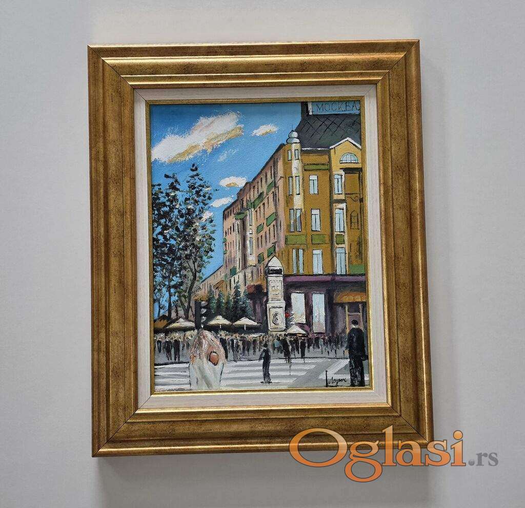 Ulje na platnu Hotel Moskva, prelepo umetnicko delo. Slika je uramljena u jako lep ram, dimenzije slike sa ramom 56 x 46. Privatna kolekcija.