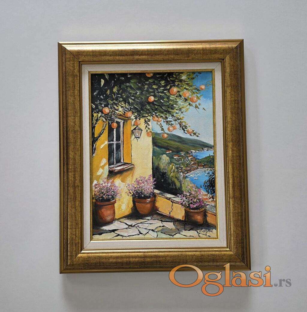 Ulje na platnu Pod krosnjom pomorandzi, prelepo umetnicko delo. Slika je uramljena u jako lep ram, dimenzije slike sa ramom 56 x 46. Privatna kolekcija.