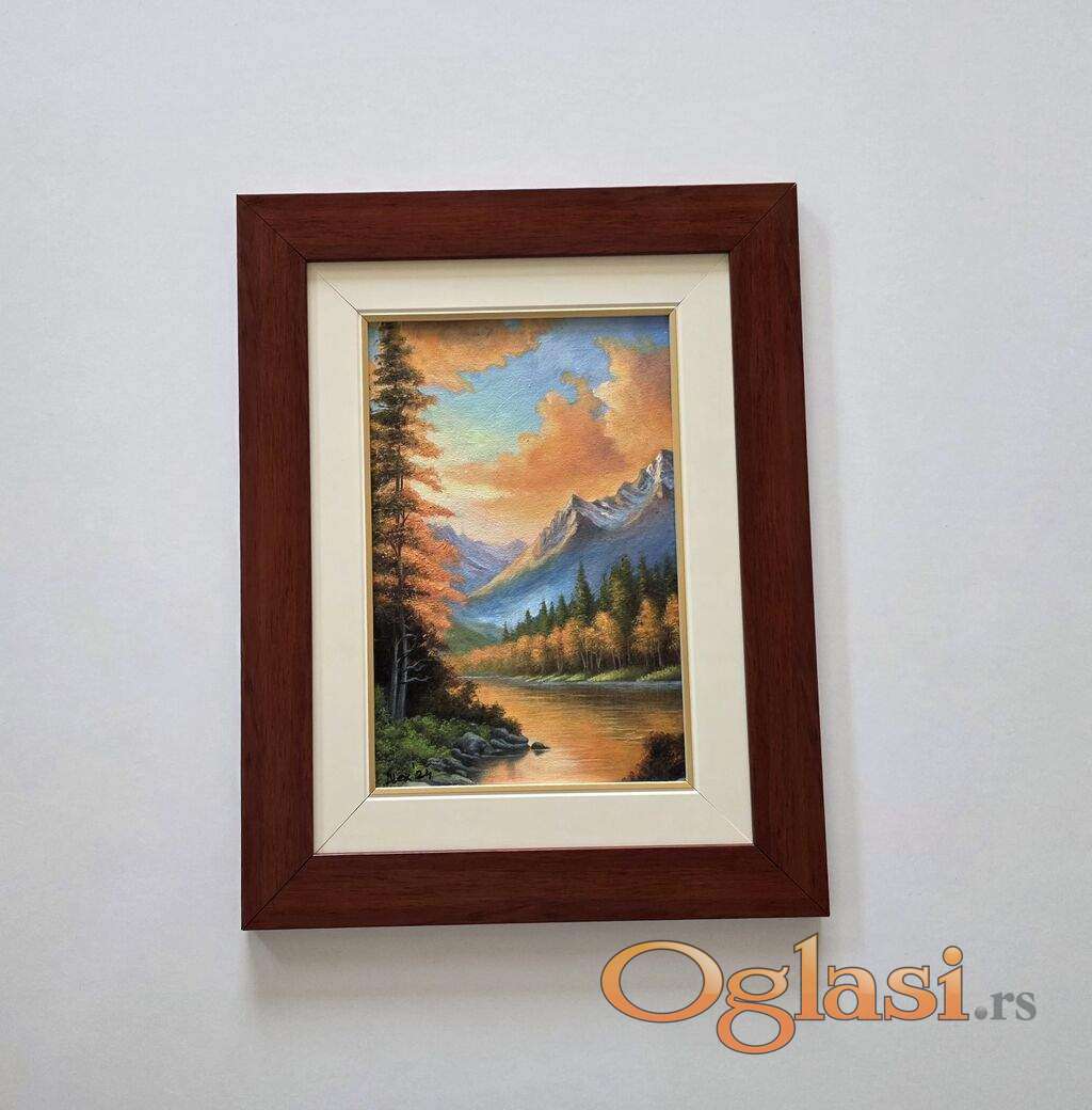 Ulje na platnu Suton u planini, prelepo umetnicko delo. Slika je uramljena u jako lep ram, dimenzije slike sa ramom 45 x 35. Privatna kolekcija.