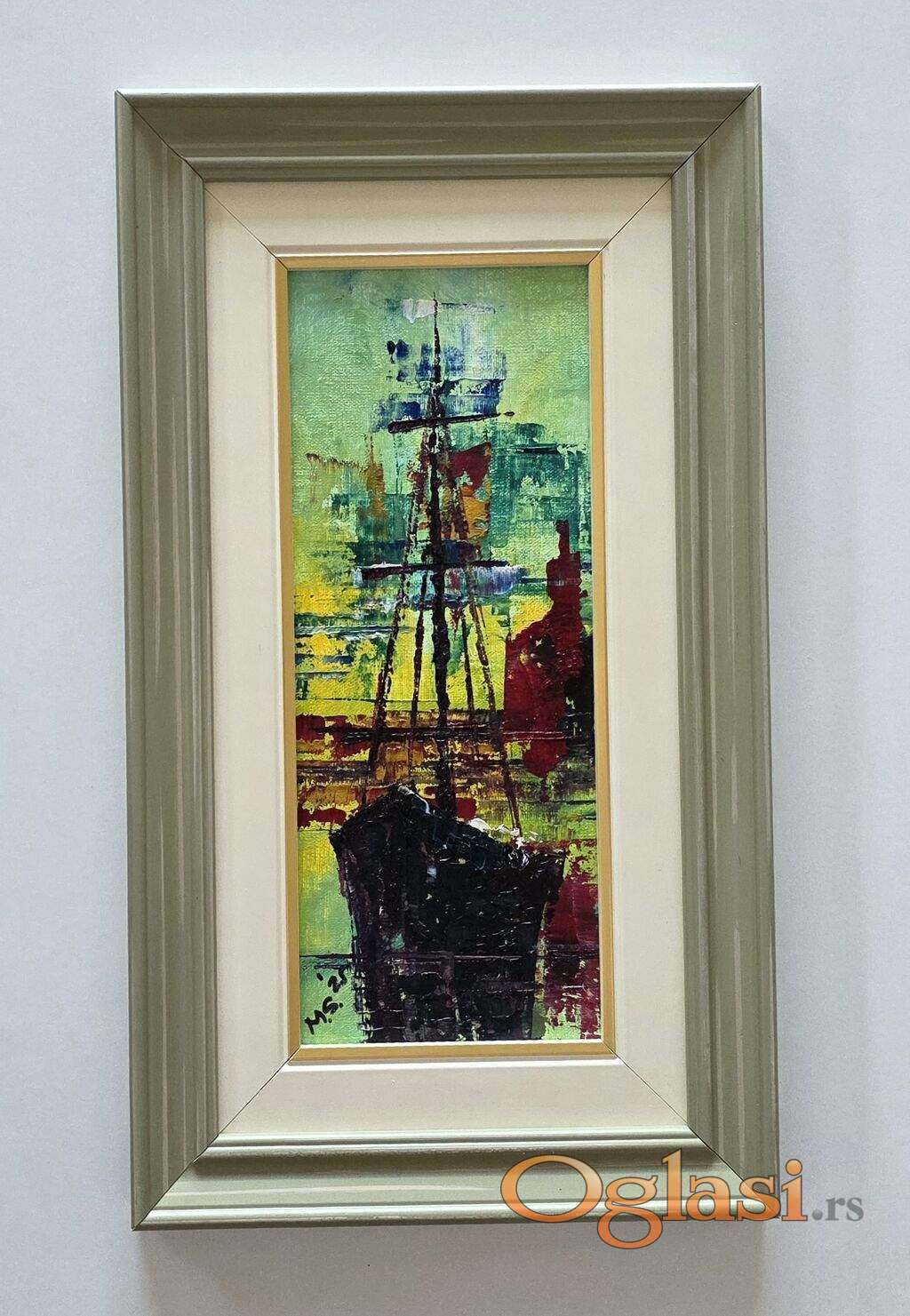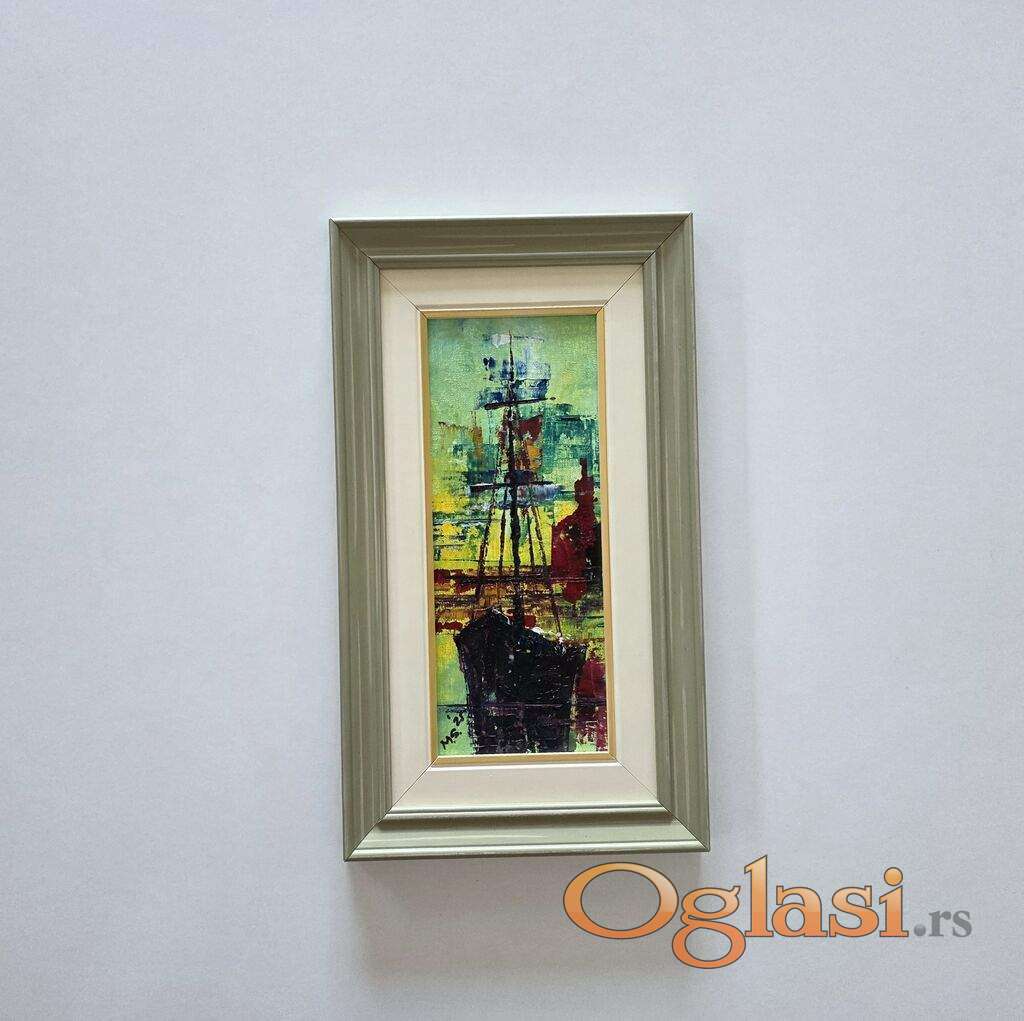 Ulje na platnu Usidren brod, prelepo umetnicko delo. Minijatura. Slika je uramljena u jako lep ram, dimenzije slike sa ramom 35 x 20. Privatna kolekcija.
