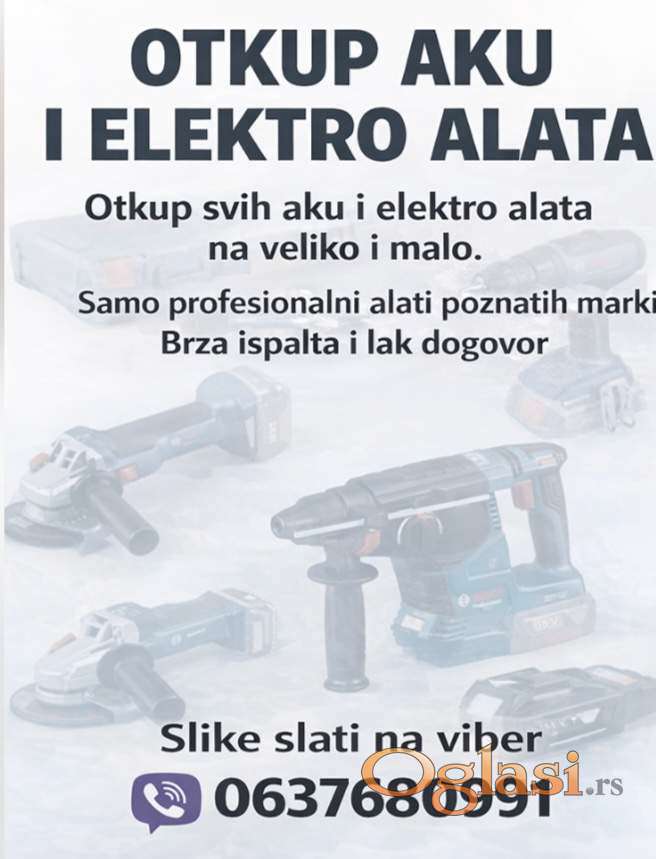Vrsimo OTKUP svih vrsta elektricnih i aku alata kao i rucnih, ukoliko imate vecu kolicninu alata mozete nam poslati slike artikala koje prodajete na viber sa cenom . viber 0637680991