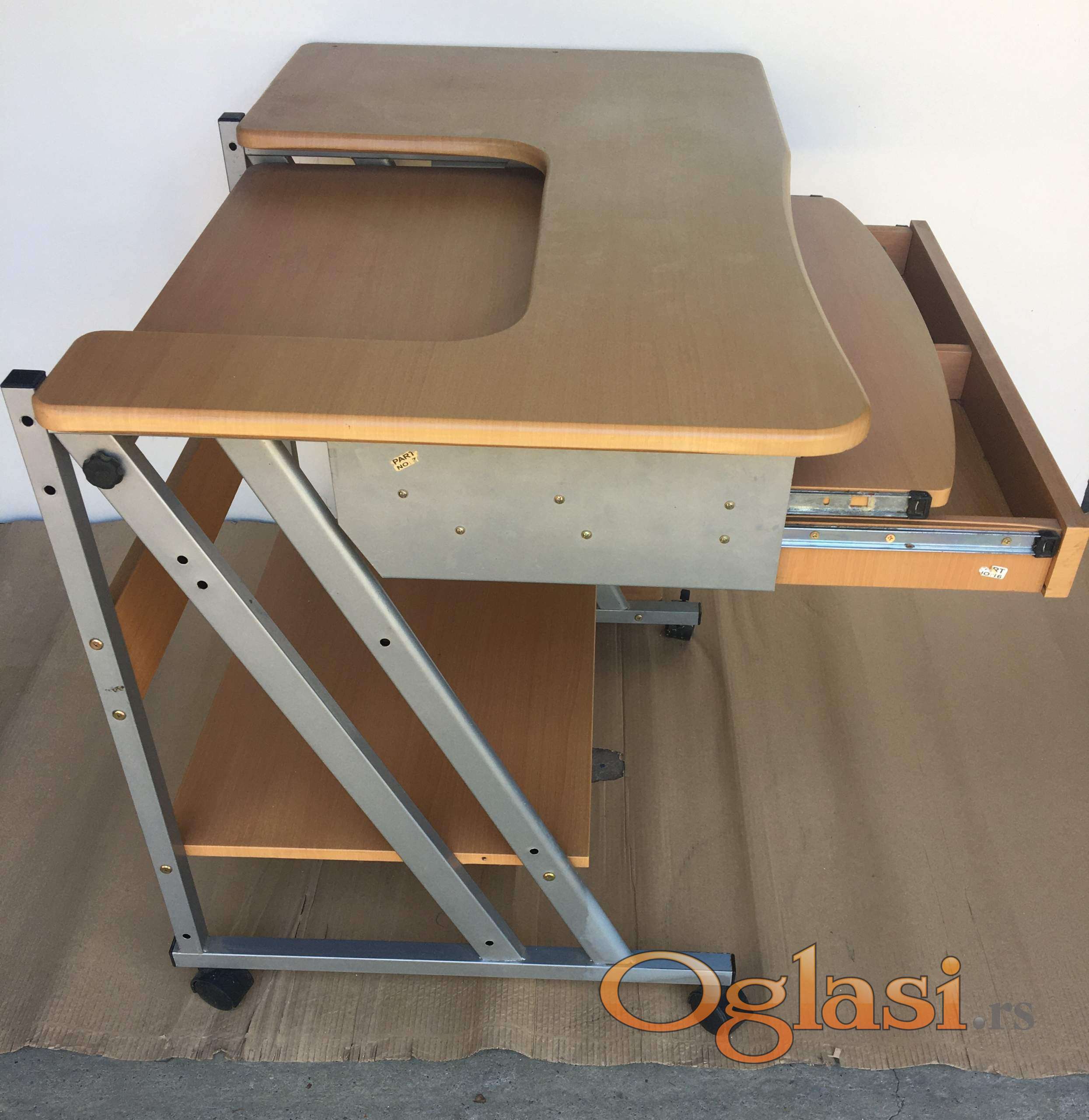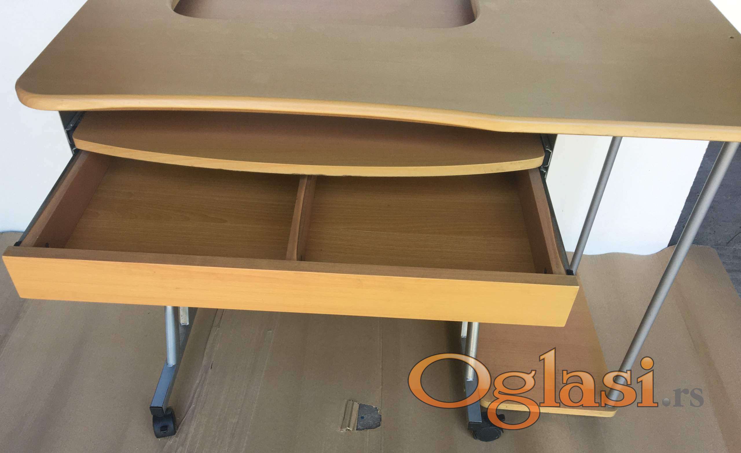 Prodajem kompjuterski sol malo koristen .Praktican za decu .Sa fiokom i skrivenom policom za tastaturu .Pokretan sa cetiri tockica.Metalna konstrukcija.