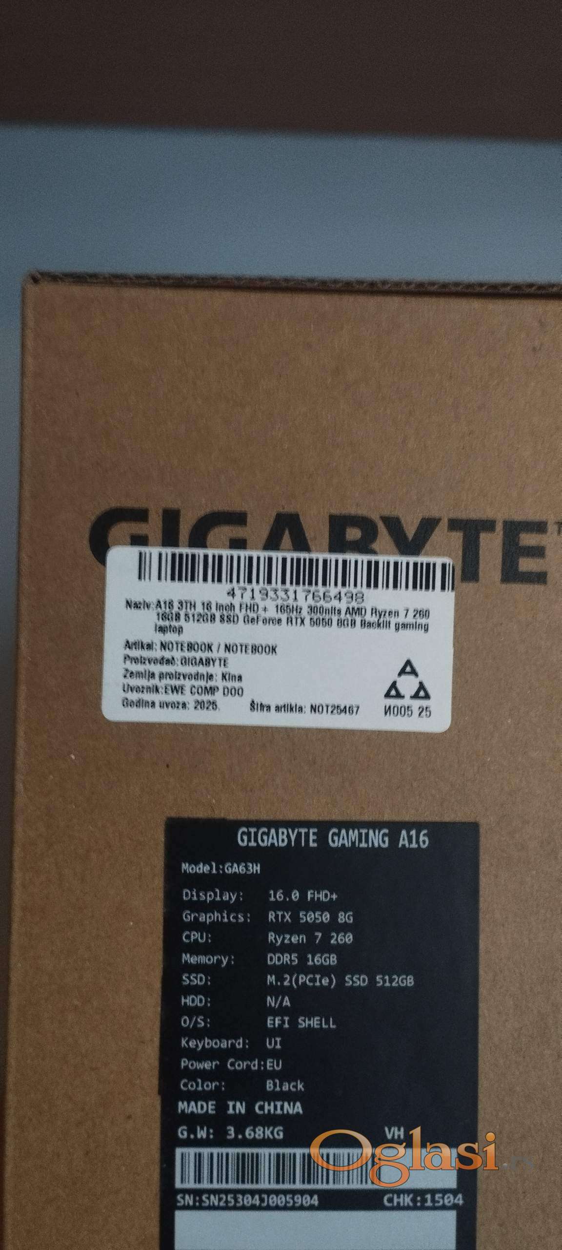 Na prodaju Gigabyte A16 3TH 16 Ryzen 7 16 Gb 512 Gaming Laptop, potpuno nov, nekoriscen u kutiji sa nalepnicom.