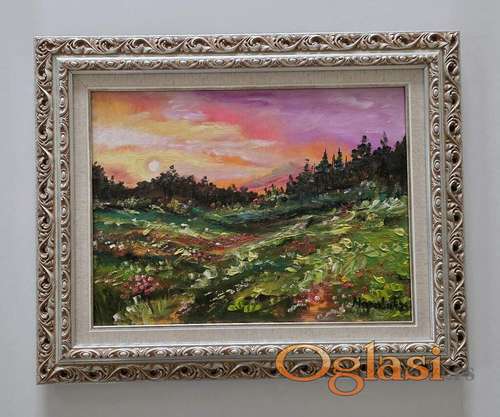Tekst oglasa: <p>Ulje na platnu Suton u prirodi, prelepo umetnicko delo. Slika je uramljena u jako lep ram, dimenzije slike sa ramom 55 x 45. Privatna kolekcija.</p> |