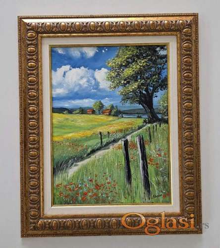 Tekst oglasa: <p>Ulje na platnu Seoski raj, prelepo umetnicko delo. Slika je uramljena u jako lep, luksuzan ram. Dimenzije slike sa ramom 58 x 48. Privatna kolekcija.</p> |